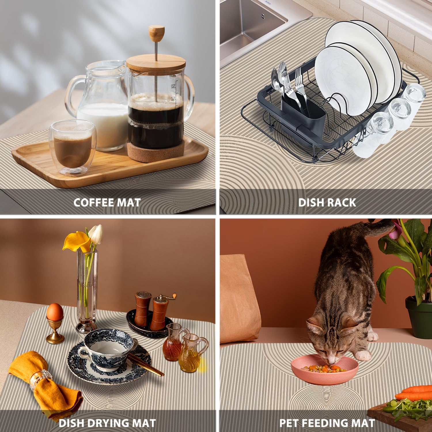 - 【Versatile Usage】Our kitchen drying mats are suitable for use on kitchen counters, countertops, and dining tables. Additionally, they can serve as coffee bar accessories, bar mats, or pet feeding mats.