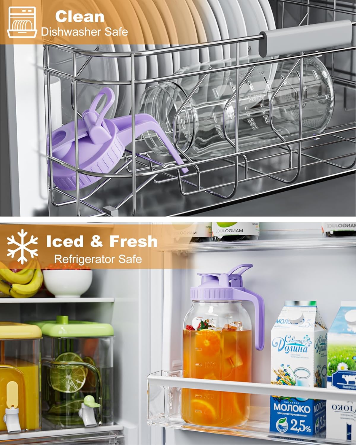 - Premium Quality Glass Jug: This glass water pitcher is crafted from high-quality, food-grade glass that is durable and resistant to breaking. Both the glass jar and lid are free of lead, cadmium, and BPA, and are odorless, ensuring that your drink's taste is not affected. The pitcher is refrigerator-safe and dishwasher-friendly