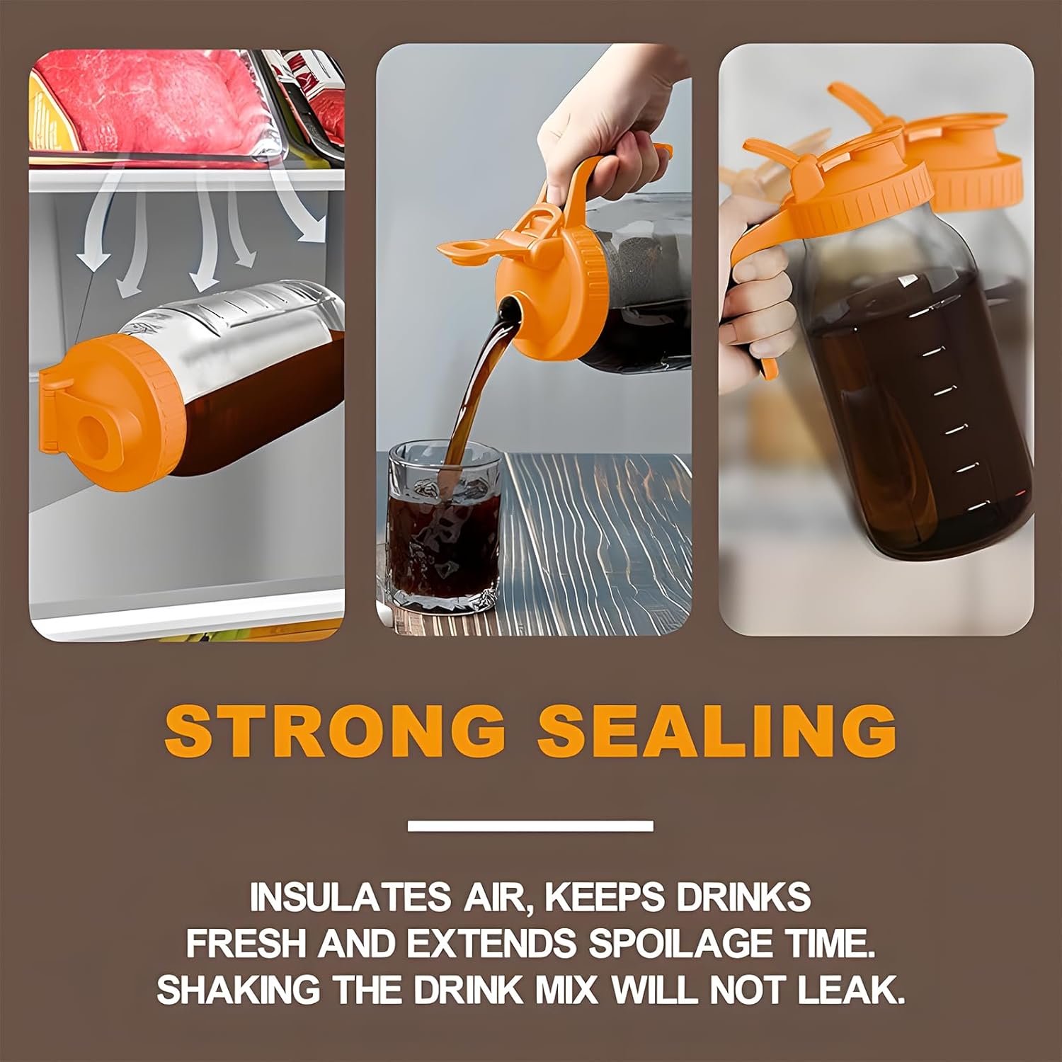 - 【Sturdy Sealing】 - Our liquid pitcher features a sturdy sealing system to keep your drinks fresh and prevent leakage. The leak-proof spout and sealing ring perfectly isolate the mason jar pour spout from the inside and outside, preventing food odors from affecting the taste. You can store your drinks with confidence, knowing that they will stay fresh and leak-free, even when the pitcher is lying down