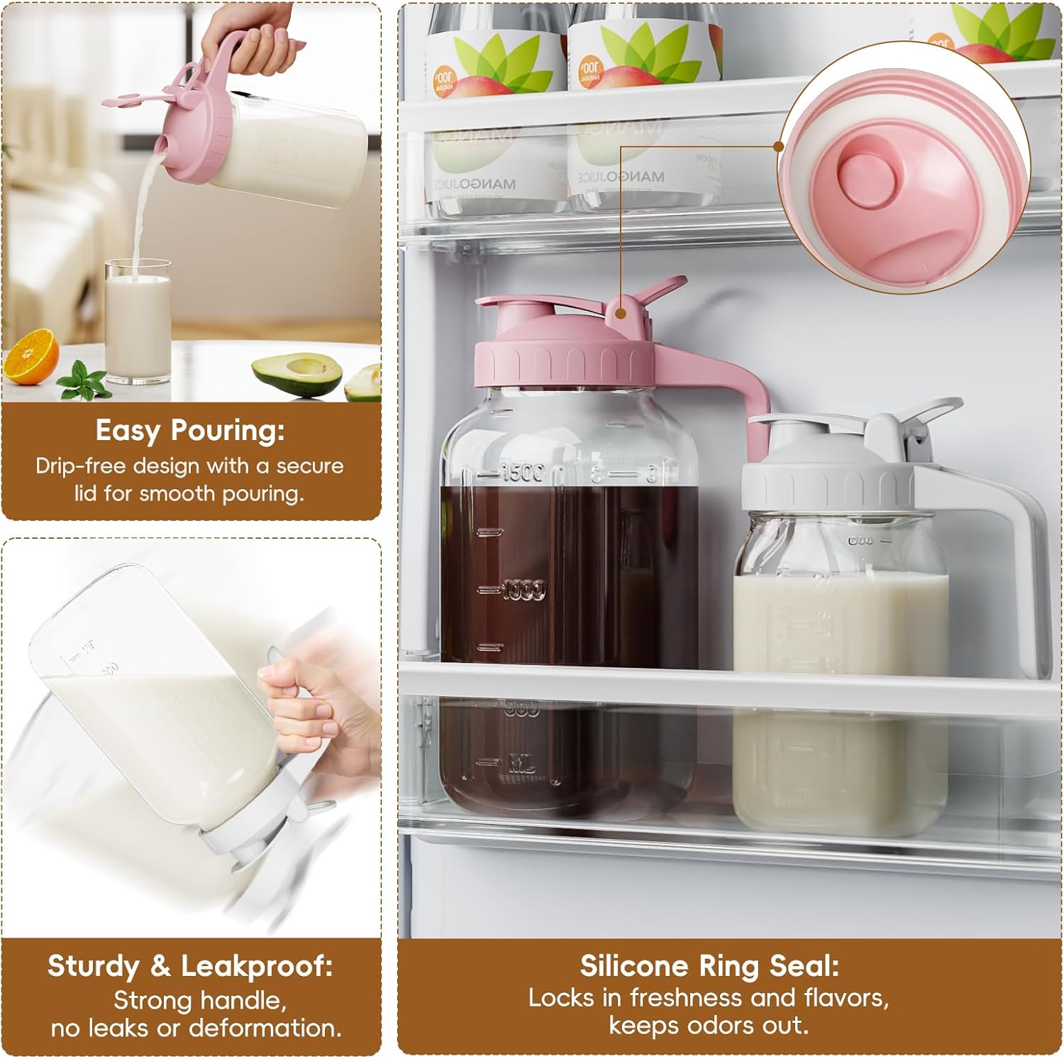 - 【Spout Sealed Lid with Handle】 - The 64oz big jug with silicone seal in the pour spout lid, Leak proof and better maintain the freshness and taste of the beverage, avoid mixing the smell of other foods in the fridge. The flip-top lid is easy to pour and the jug is securely fastened to the lid