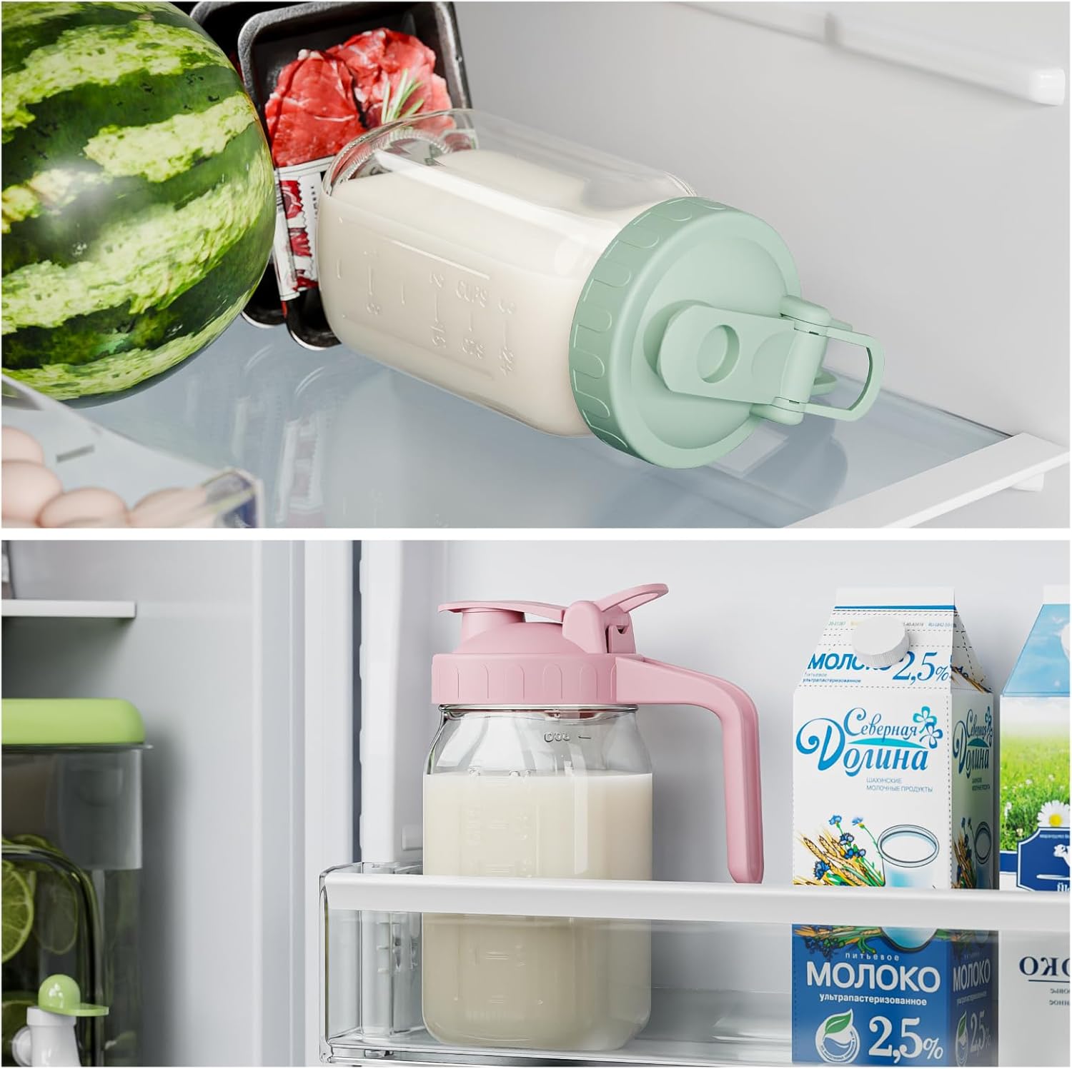 - 【Spout Sealed Lid with Handle】 - The 32oz jug with silicone seal in the pour spout lid, Leak proof and better maintain the freshness and taste of the beverage, avoid mixing the smell of other foods in the fridge. The flip-top lid is easy to pour and the jug is securely fastened to the lid