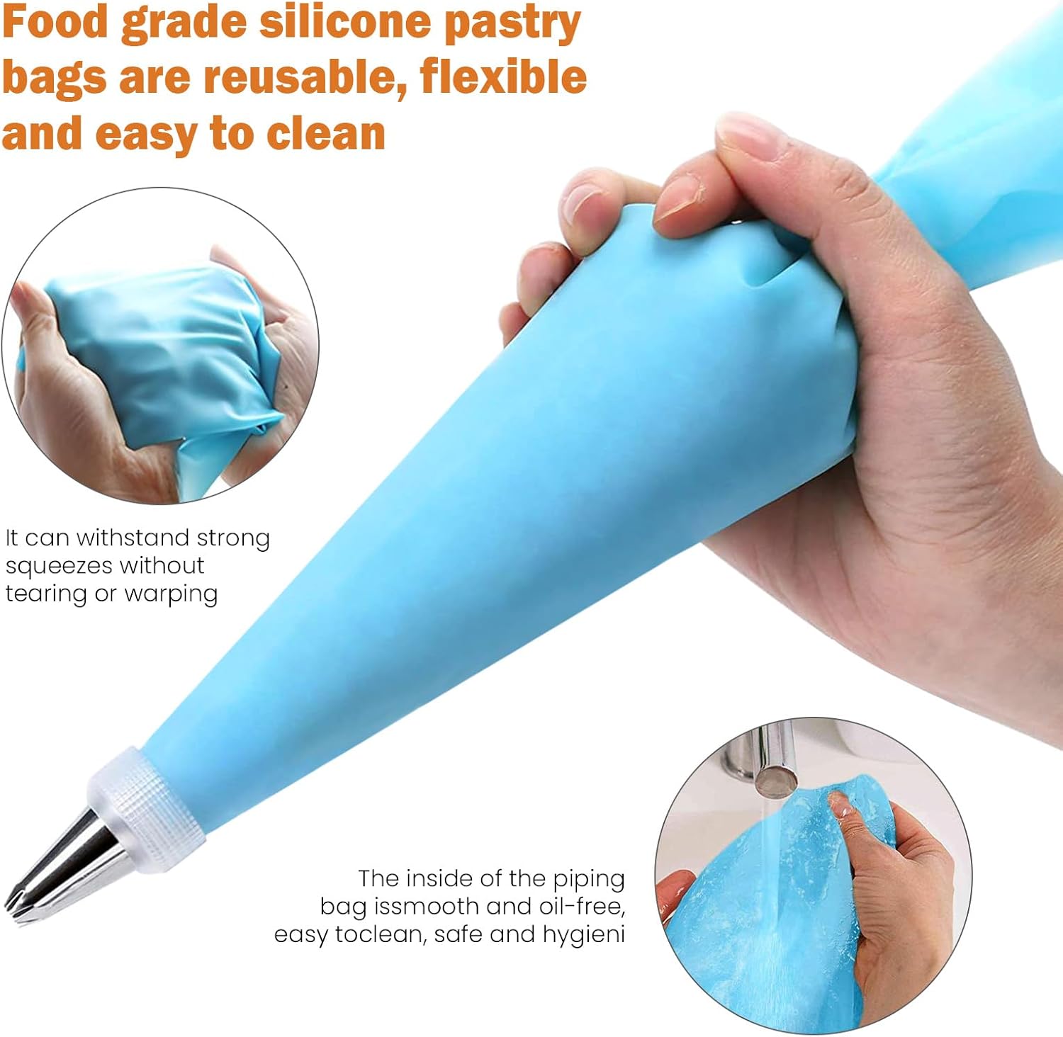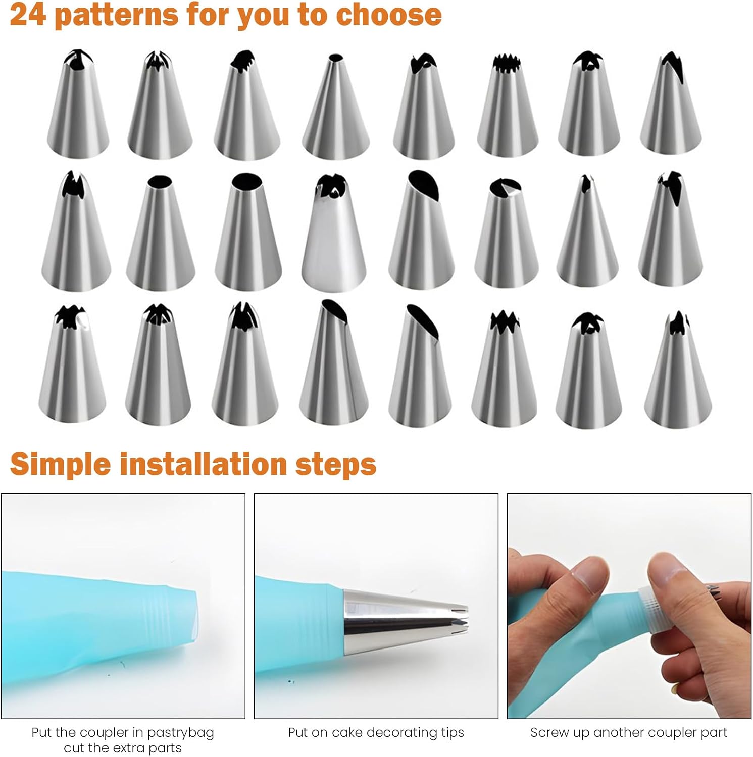 - Materials: The pastry bag is made of food-grade silicone, the nozzle for the cake decorating kit is made of 18/8 stainless steel, ensuring durability and never rusting, BPA-free, safe for contact with food.