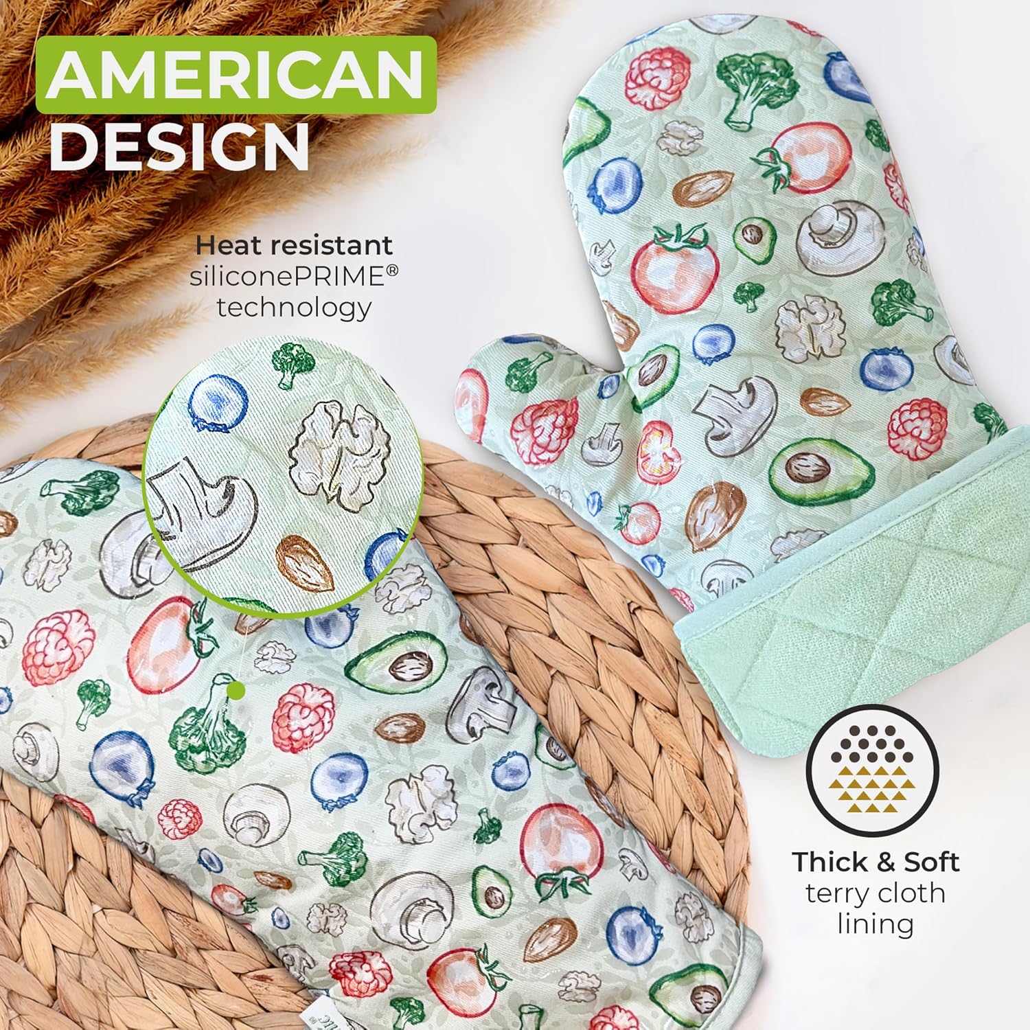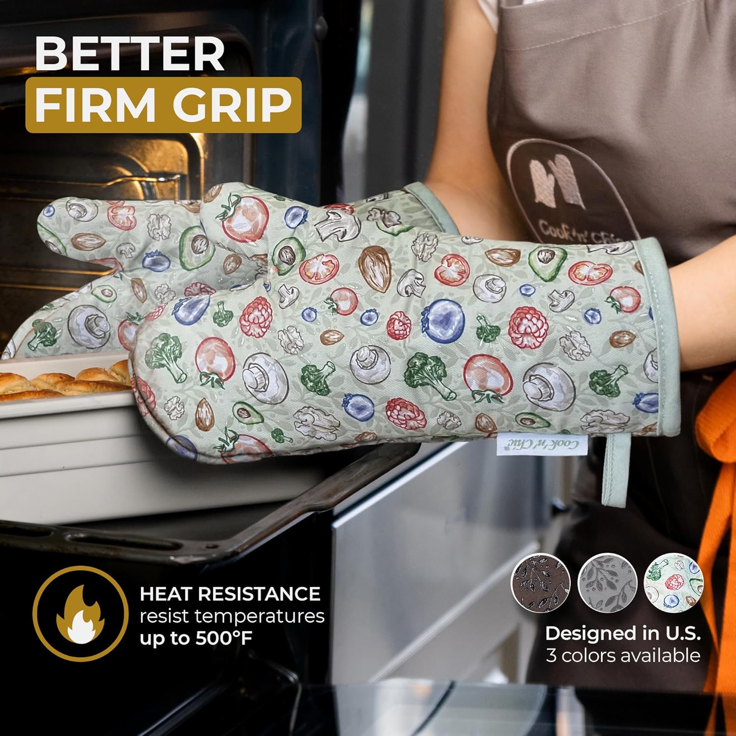 Premium Green Oven Mitts - Stylish and Heat-Resistant - Non-Slip Platinum Silicone Grip - Long and Thick - 100% Natural Cotton Exterior and Soft Terry Cloth Lining - Set of 2 by Cook'n'Chic