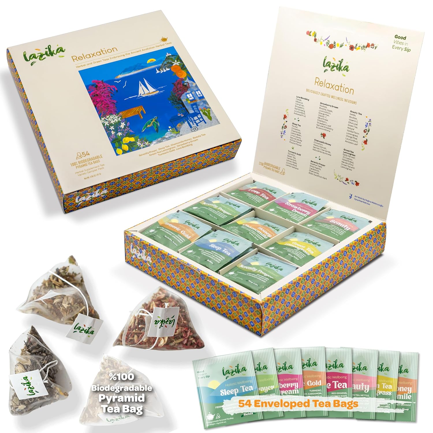Lazika Herbal Tea Variety Pack with Lovely Presentation Box, 54 Counts, Relaxation Tea Assortment Gift Set, Premium Collection with Pyramid Infuser Bag, Handcrafted