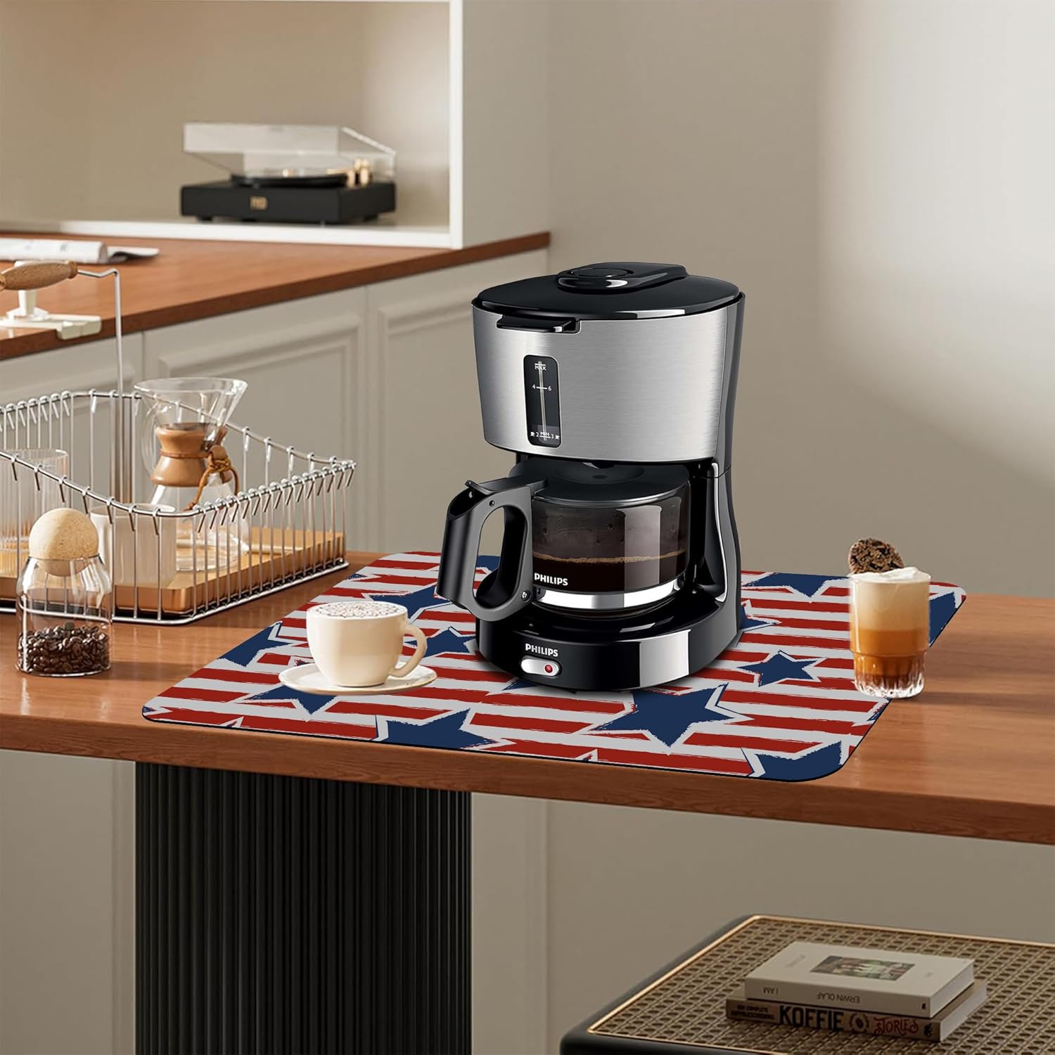 Dish Drying Mat Watercolor Blue Star Red Stripes Kitchen Mat 16"x24" Bsorbent Coffee Maker Mat for Dishes,Utensils Coffee Maker Pots and Pans Easy Clean Dish Slip Resistant Pad
