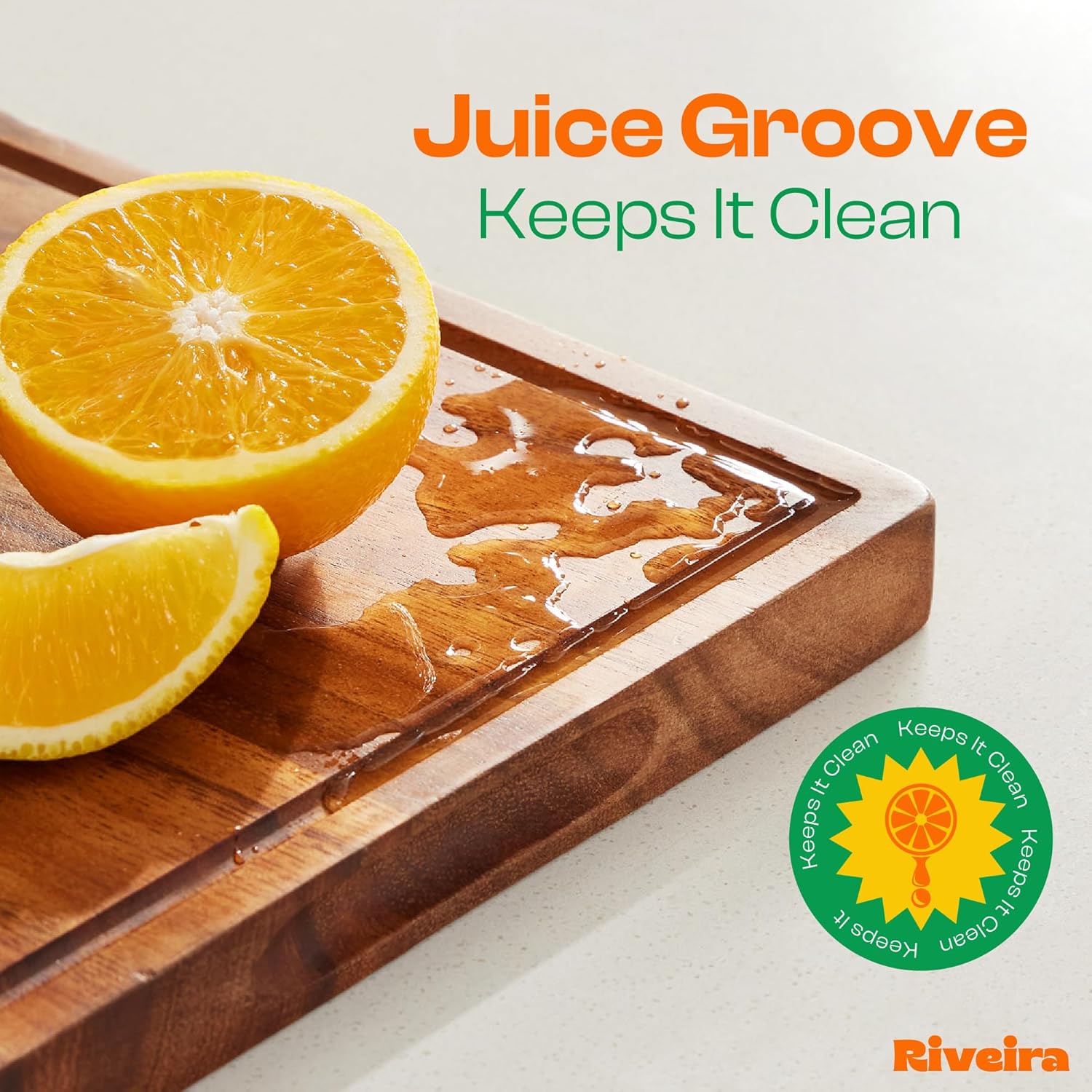 - No Mess Cutting and Transfer — Enjoy a mess-free kitchen with our wood block cutting board walnut. Equipped with deep juice grooves, these hardwood cutting boards for kitchen catch liquid runoff from meat, fruit, and other ingredients, preventing spills and countertop messes. Whether you're working in an industrial restaurant kitchen or your home, this walnut cutting board set makes cleanup a breeze. Transfer ingredients from your prep station without any fuss with Riveira wooden butcher block.