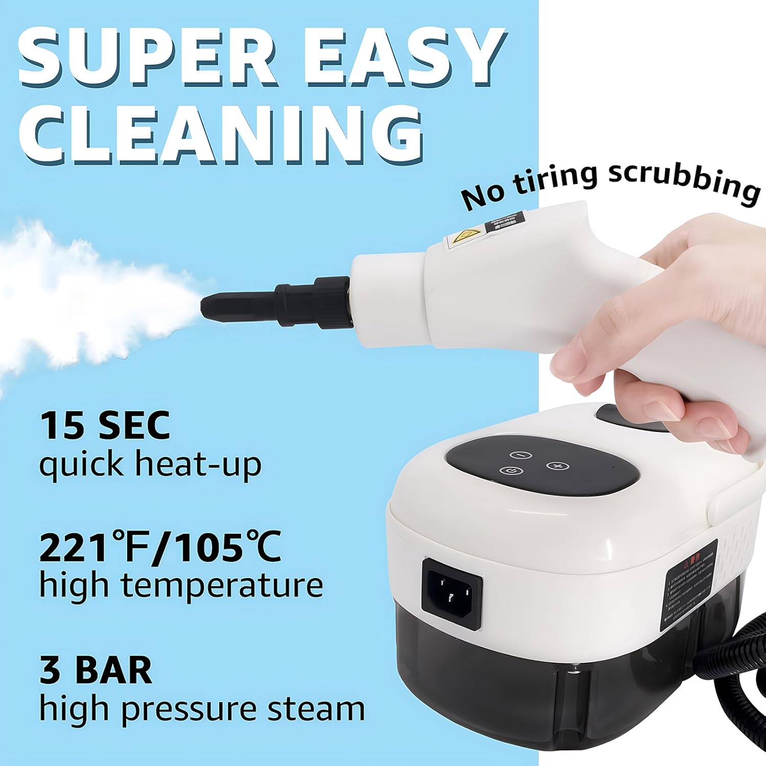 - POWERFUL STEAM CLEANER: This handheld steam cleaner has 2500W power (Working voltage: 110V), Generate 221℉ (105℃) high-temperature steam in 15 seconds with 3Bar pressure, deeply cleaning stubborn grease, grime, and stains on tiles, grout, car interiors, and upholstery.