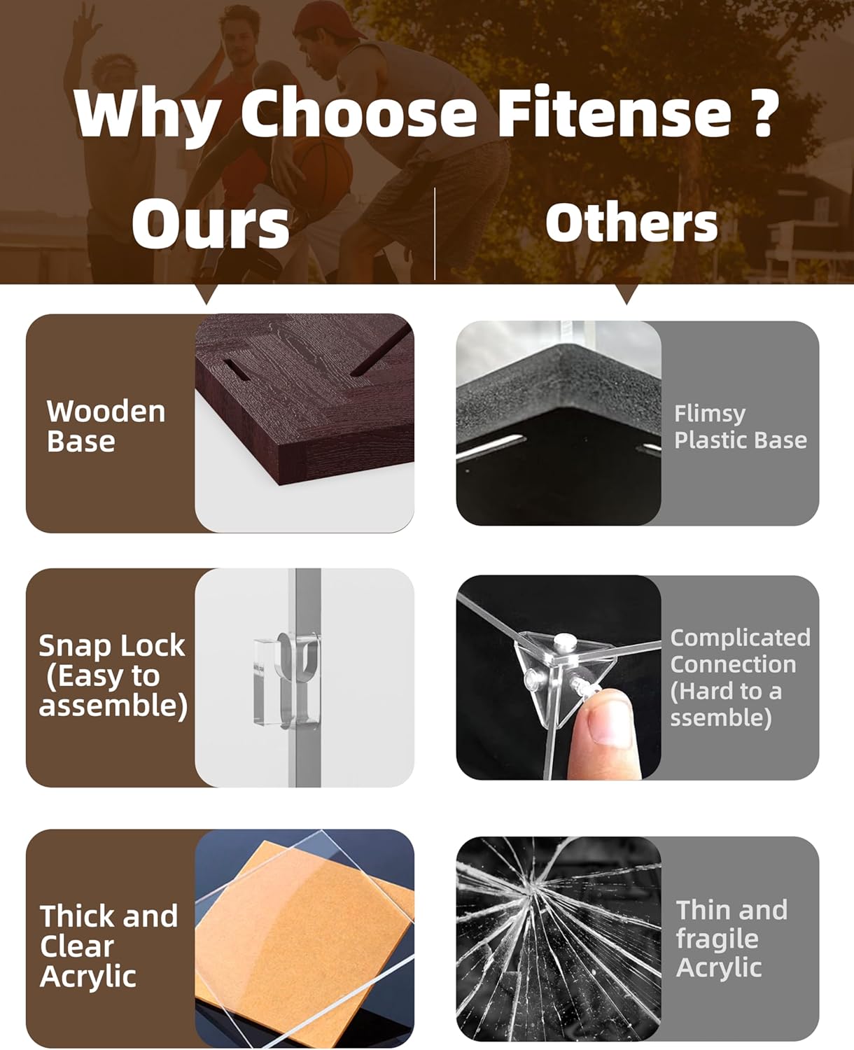 - Hassle-Free Assembly & Innovative Design: Experience the convenience of Fitense Acrylic basketball display case, ingeniously crafted for easy setup and interaction. Features traditional mortise and tenon joints for stability and durability, no nails or glue needed to quickly assemble the acrylic box. Just 1 Minute, all done! PS: Before assembly, please remove the protective film from the acrylic border