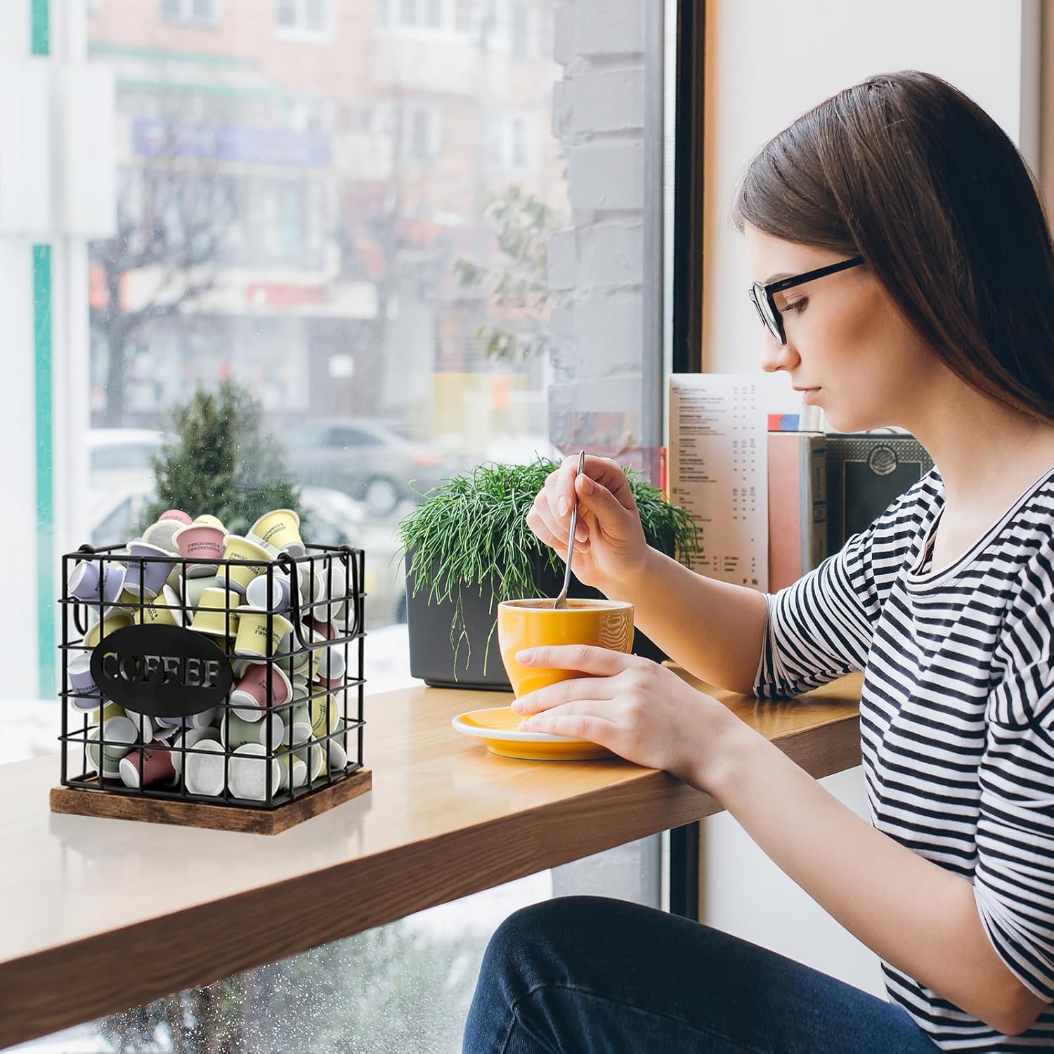 - ATTRACTIVE VINTAGE DECOR: Give your coffee bar a stylish upgrade with our coffee pod holder, crafted with frosted iron wire and rustic brown wood panels for a touch of elegance. Ideal for any countertop in the kitchen or office