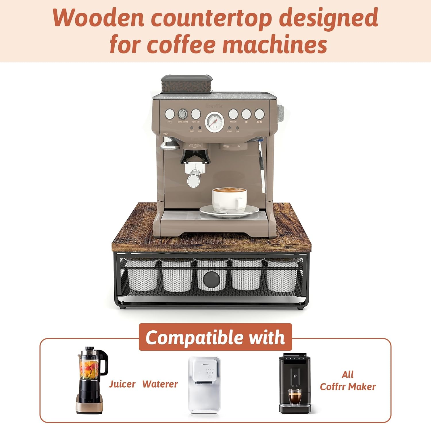 - Premium Materials & Easy Cleaning :The K-Cup Storage Drawer is made from High-Quality Carbon Steel and Durable Particle Board, Preventing Deformation and Ensuring Long-lasting Use. Equipped with Soundproof Pads on the Sliding Rails, the Drawer Opens and Closes Quietly, Avoiding any Noise. The Wood Desktop is Easy to Clean — Just Wipe away any Coffee Spills with a Cloth for a Fresh Look.