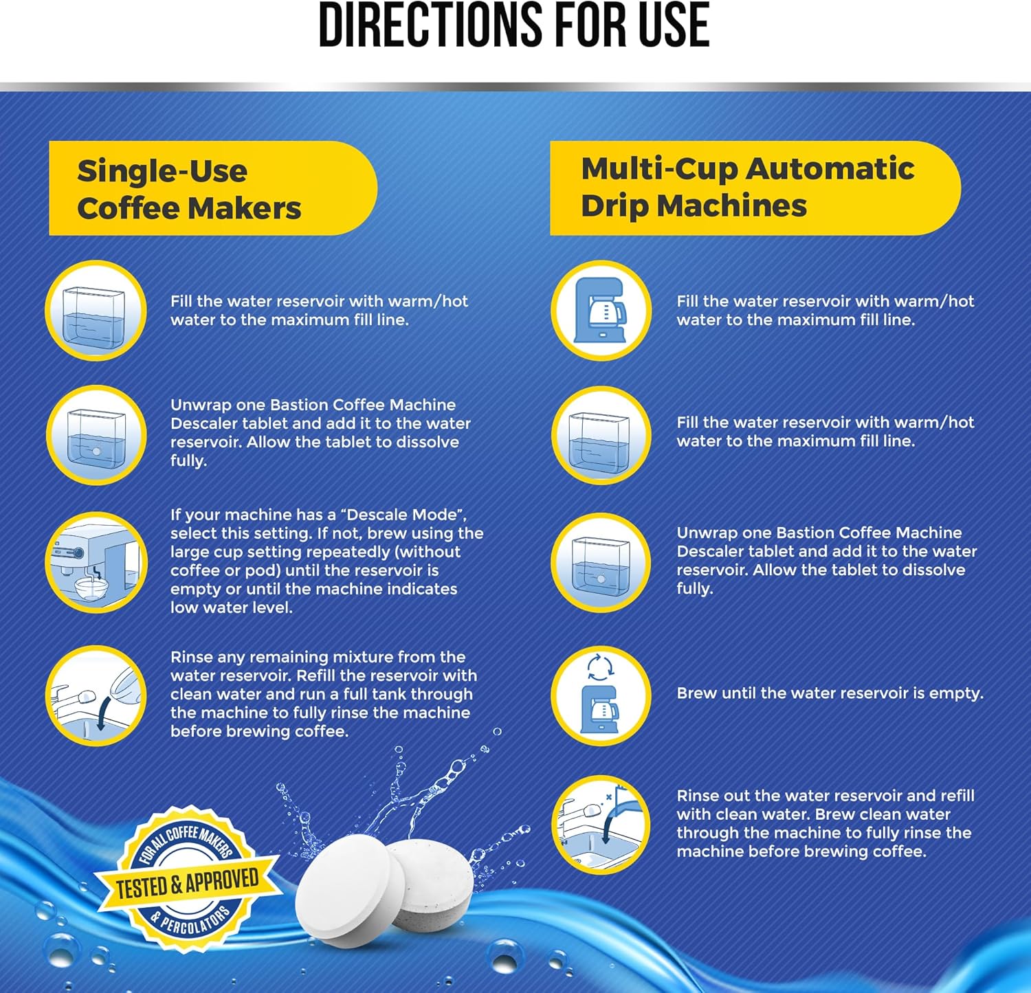 - Simple and Convenient Solution: Cleaning your coffee maker shouldn’t be a chore. Bastion Descaler Cleaner Tablets simplify the process with an easy-to-use, drop-in formula that takes the effort out of maintenance. Spend less time worrying about your machine and more time enjoying your favorite beverages, all while keeping your coffee maker in perfect working condition.