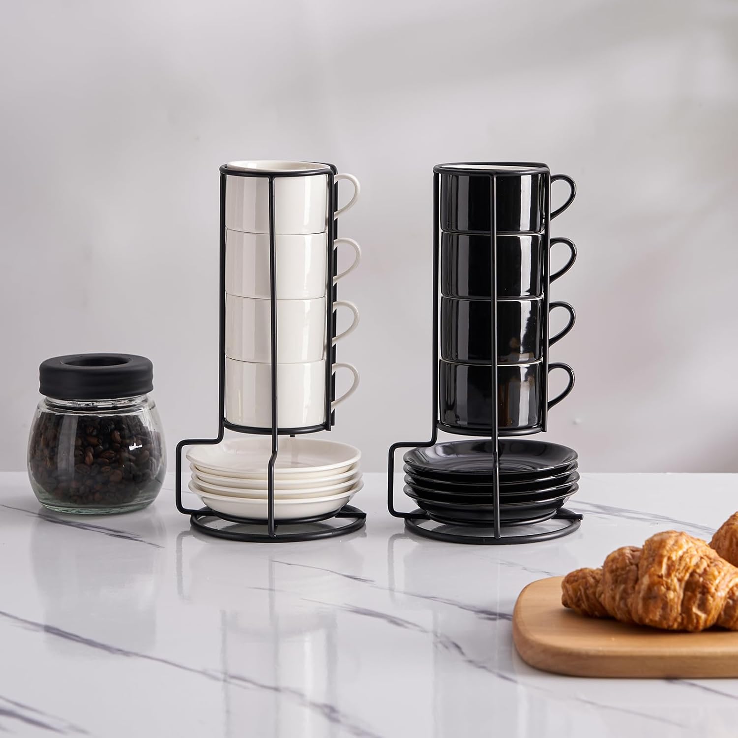 2.5oz Porcelain Stackable Espresso Cups with Saucers and Metal Stand Set of 4, Stackable Cappuccino Cups, Black Expresso Shots Cup Set for Coffee Drinks, Latte, Tea