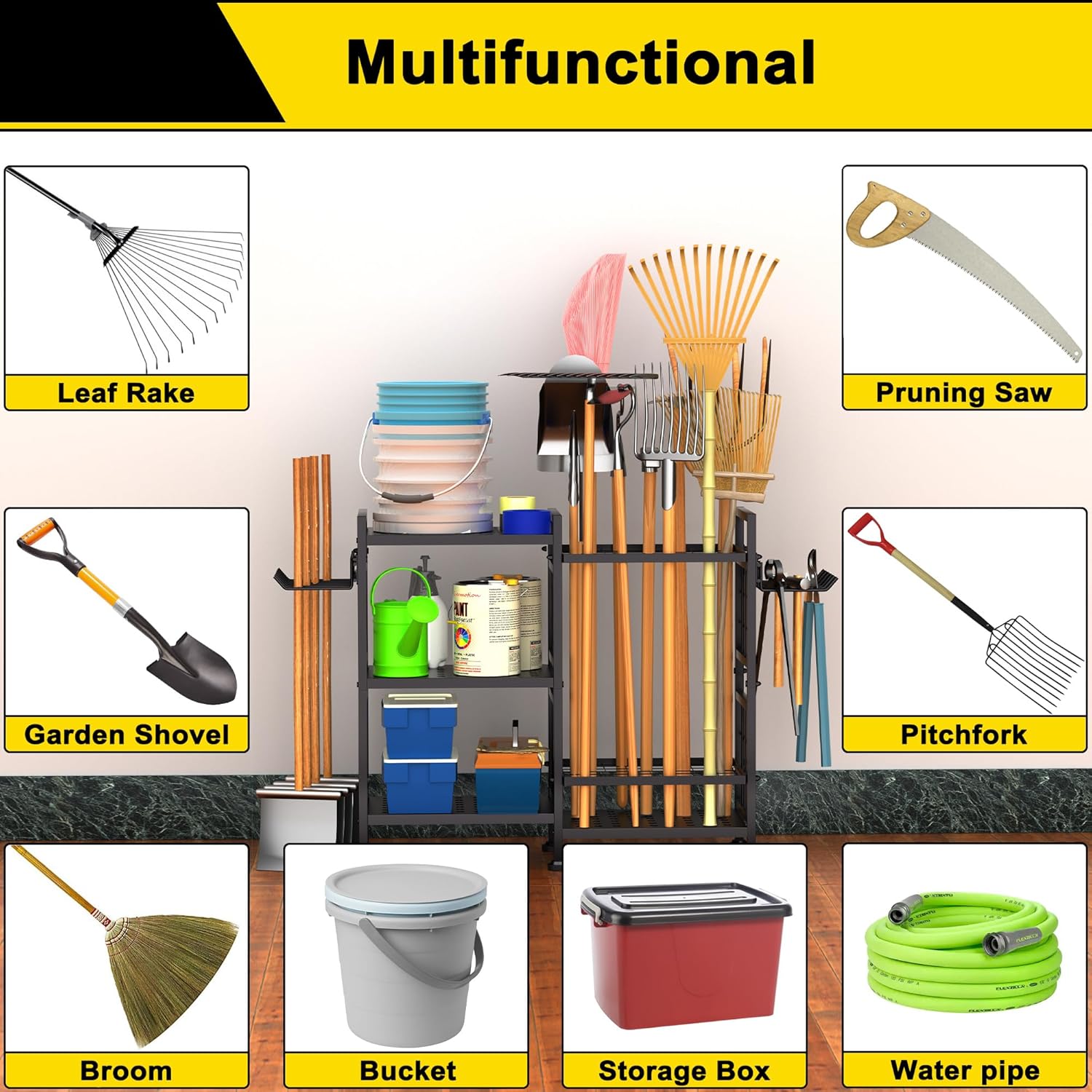 - 【High Quality Material】This garage tool storage rack is made of sturdy and durable coated steel frame that is strong enough to withstand both indoor and outdoor use for a long time. In addition, our garden tools organizer is equipped with adjustable feet to fine-tune the height of the four "legs" and can be used on uneven ground