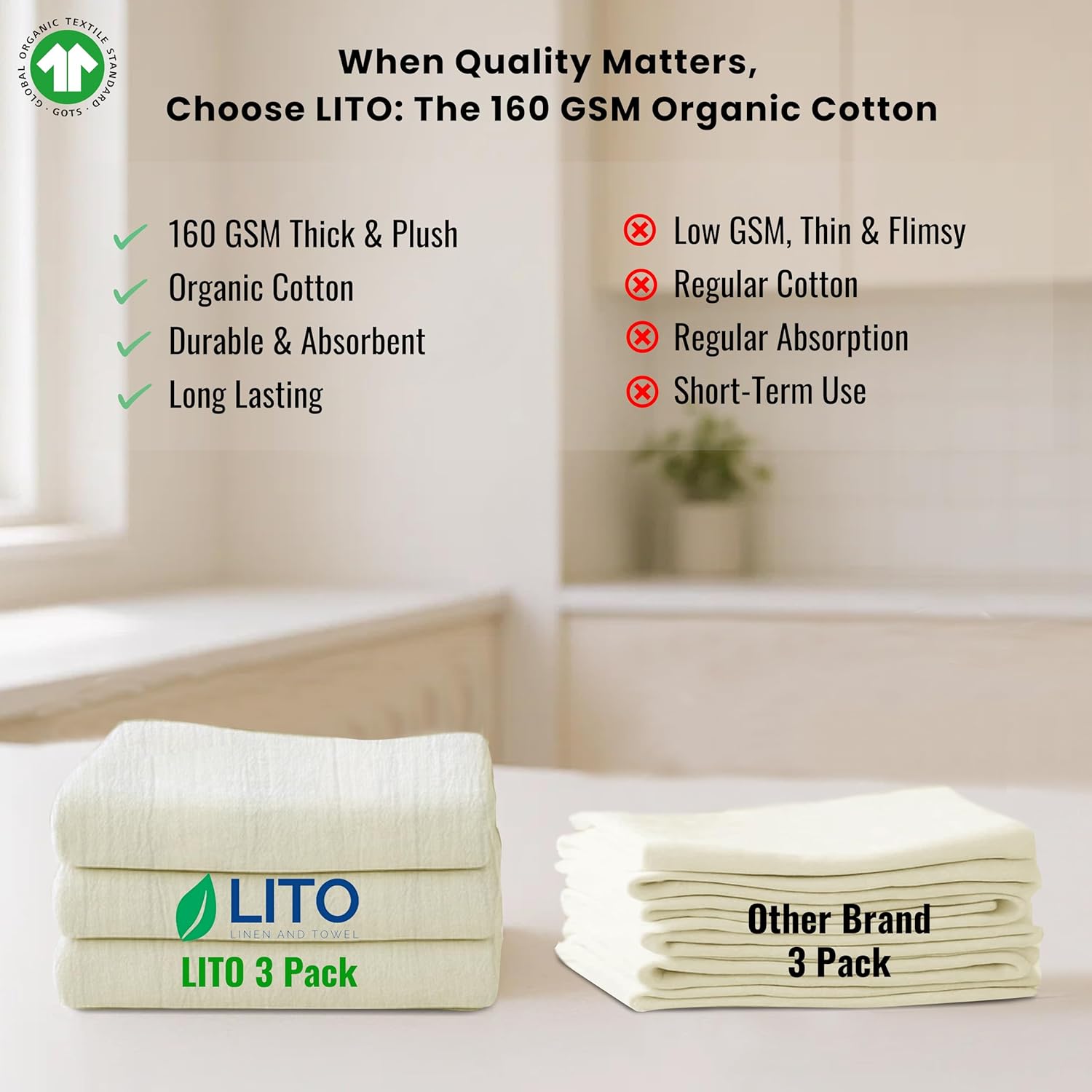 - ✅ Organic 160 GSM Thick Flour Sack Towels – Kitchen-Grade Absorbency Say goodbye to flimsy towels! LITO's ultra-dense 160 GSM 100% ring-spun cotton fabric with a thread count of 130, flour sack towels deliver superior - perfect for kitchen drying, wiping, and heavy-duty use.
