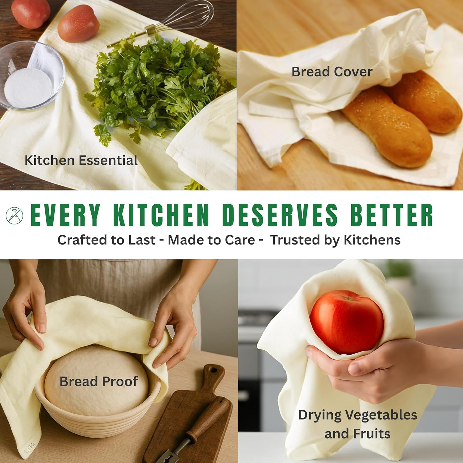 - ✅ MULTIPURPOSE: Their lint-free pure ring-spun cotton composition makes them perfect for drying glassware, hands and surfaces. Moreover, they excel at tasks like cheese straining, salad spinning, bread proofing, sourdough, bread basket liner, and even serving as reliable dough covers for baking.