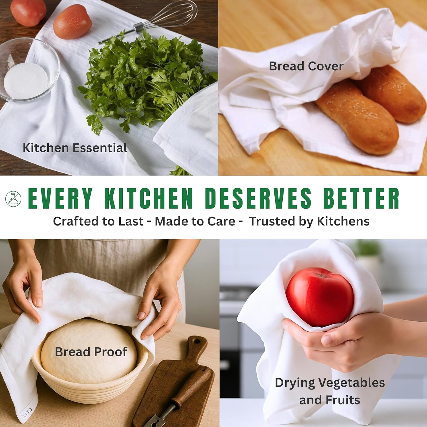 - ✅ MULTIPURPOSE: Their lint-free pure ring-spun cotton composition makes them perfect for drying glassware, hands and surfaces. Moreover, they excel at tasks like cheese straining, salad spinning, bread proofing, sourdough, bread basket liner, and even serving as reliable dough covers for baking.