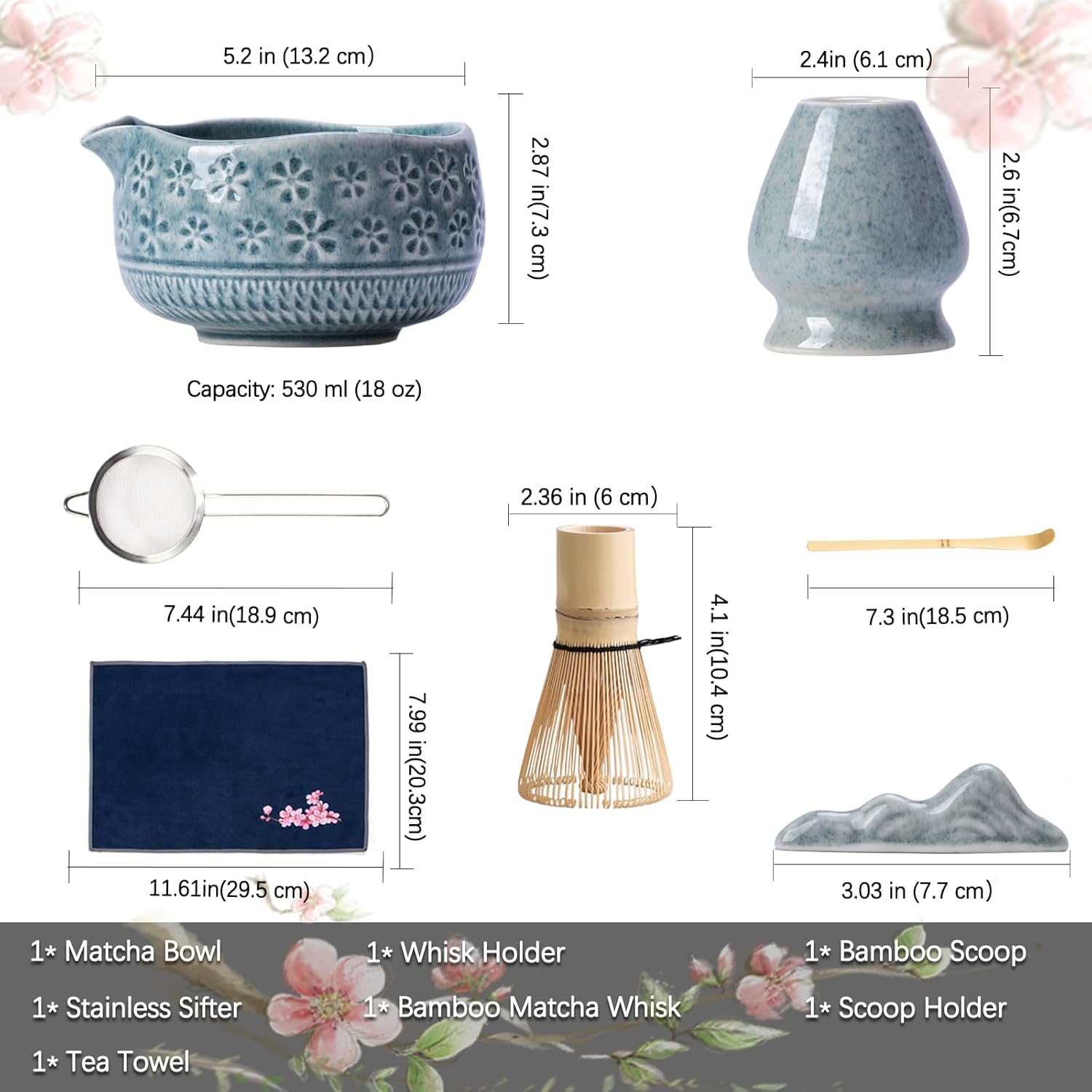 - Complete Matcha Kit: This matcha kit includes essentials for an authentic matcha experience: 1* Bamboo Matcha Whisk, 1* Bamboo Scoop, 1* Scoop Rest, 1* Stainless steel sifter, 1* 530 ml/18 oz Ceramic Matcha Bowl (Chawan), 1* Whisk Holder, 1* Cherry blossoms Tea Towel and 1* Hand book. Each tool is crafted with precision, designed to make your matcha lifestyle effortlessly stylish.