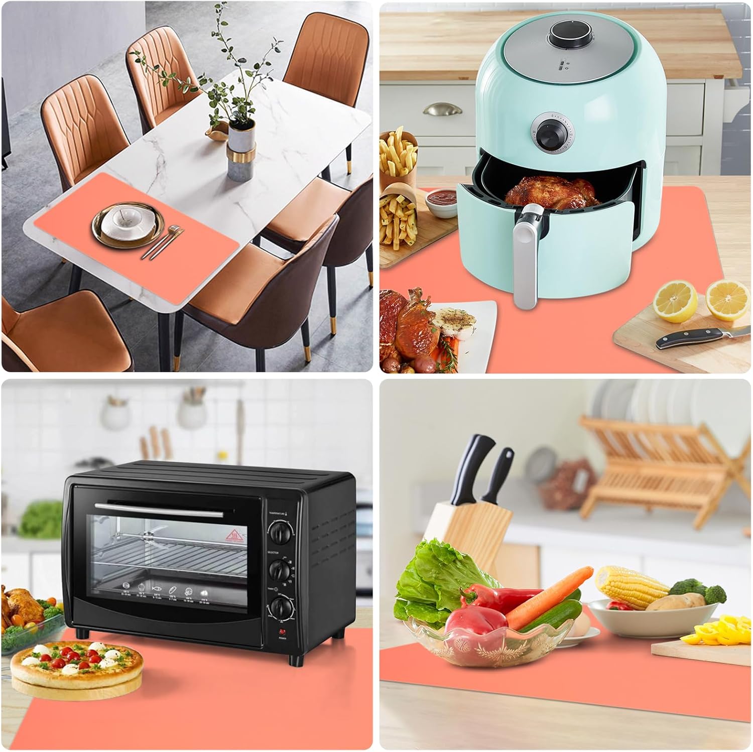 - Extra large silicone mat: Size of 36” x 24”, almost can fit most kitchen countertops, dining tables and other workbench. It can be placed under the air fryer, microwave, toaster oven, induction stove, coffee maker to protect the kitchen countertops and other surfaces against spills, scratches, grease, heat, etc. It’s cuttable to fit different sizes and shapes.