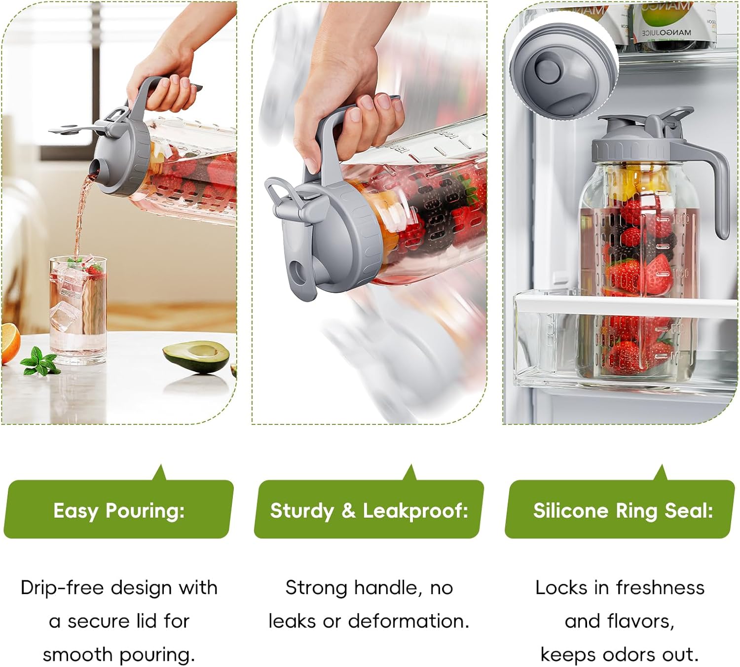 Fruit Infuser Water Pitcher,Glass Mason Jar Pitcher,64oz(2 Quart) Wide Mouth Jug with Pour Spout Handle Lid for Fruit Drinks,Cold Brew Coffee,Ice Beverage,Iced Juice,Lemonade,Sun Tea Container