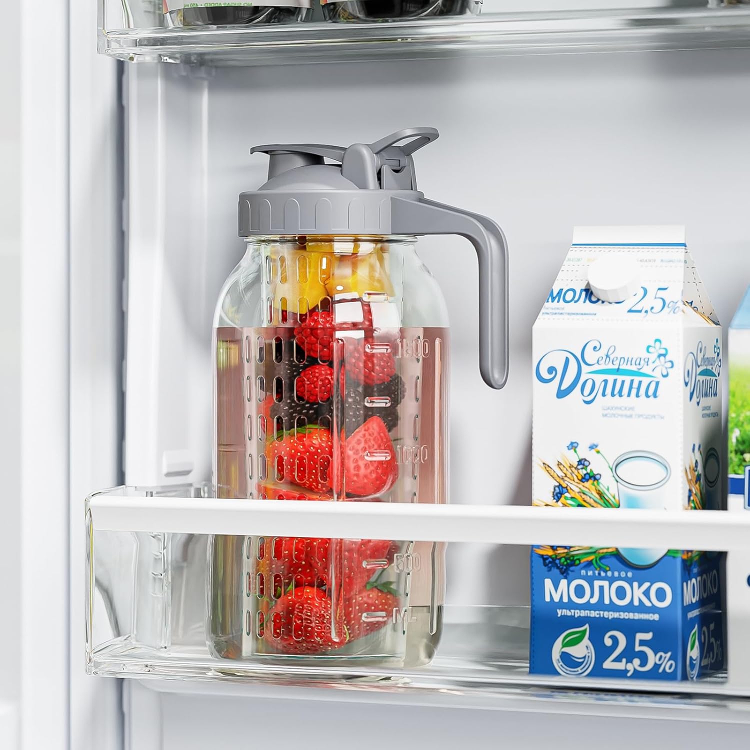 - Stylish Look & Ergonomic Handle: The clear design lets you see the bright colors of your drinks and fruits. The ergonomic handle supports a full jar, allowing easy pouring and fridge storage with volume markings for precise intake.