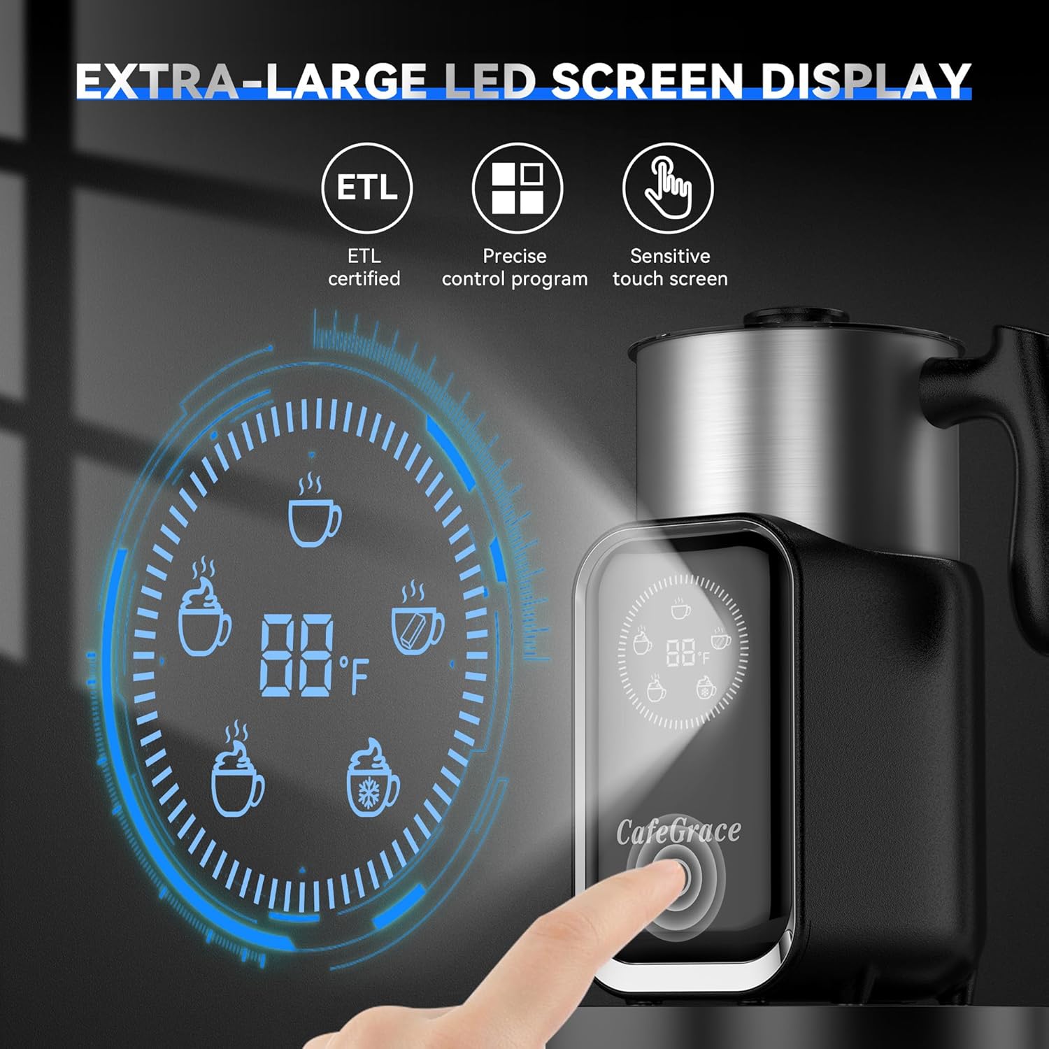 - ăEXTRA LARGE DISPLAY ă The high-definition LCD touch display can clearly show the type of milk froth being made and the temperature change of the milk froth. The aperture on the display will blink while running, making the process of making milk froth more interesting.