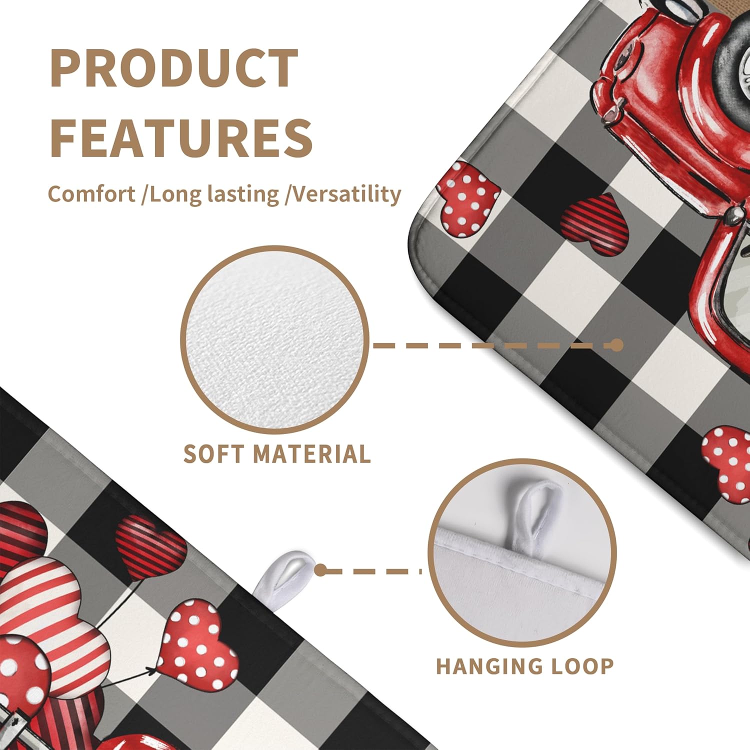 - [Quick Absorption]: Made of absorbent material, our Valentines day kitchen mat Buffalo Plaid Hearts Truck Love large dish drying mat absorbs water stains quickly, keeping your table top dry and clean, avoiding water stains and leaks, providing you with a pleasant and dry dining or working experience.