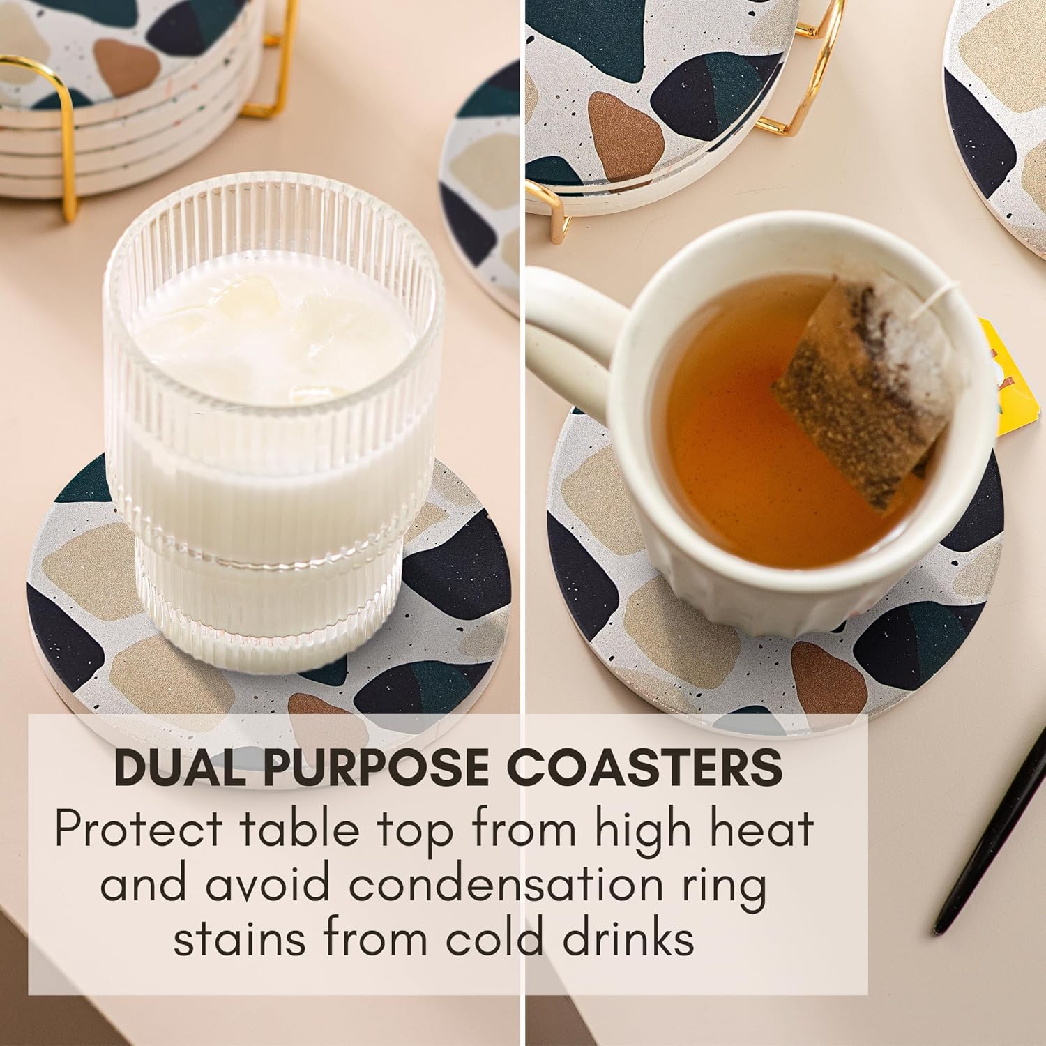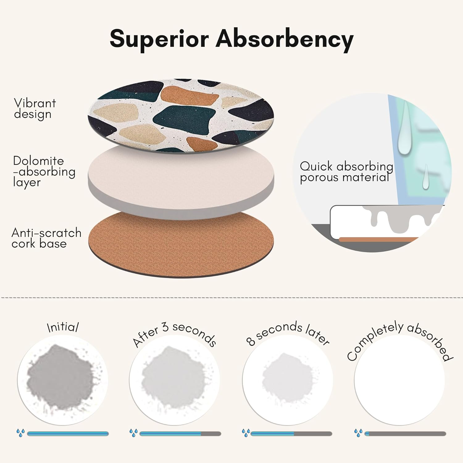 - Highly Absorbent for Hot & Cold Drinks: Our absorbent coasters are made of quality diatomite that absorbs condensation from cold drinks, spills from hot drinks and the absorbency will not detoriate over time.