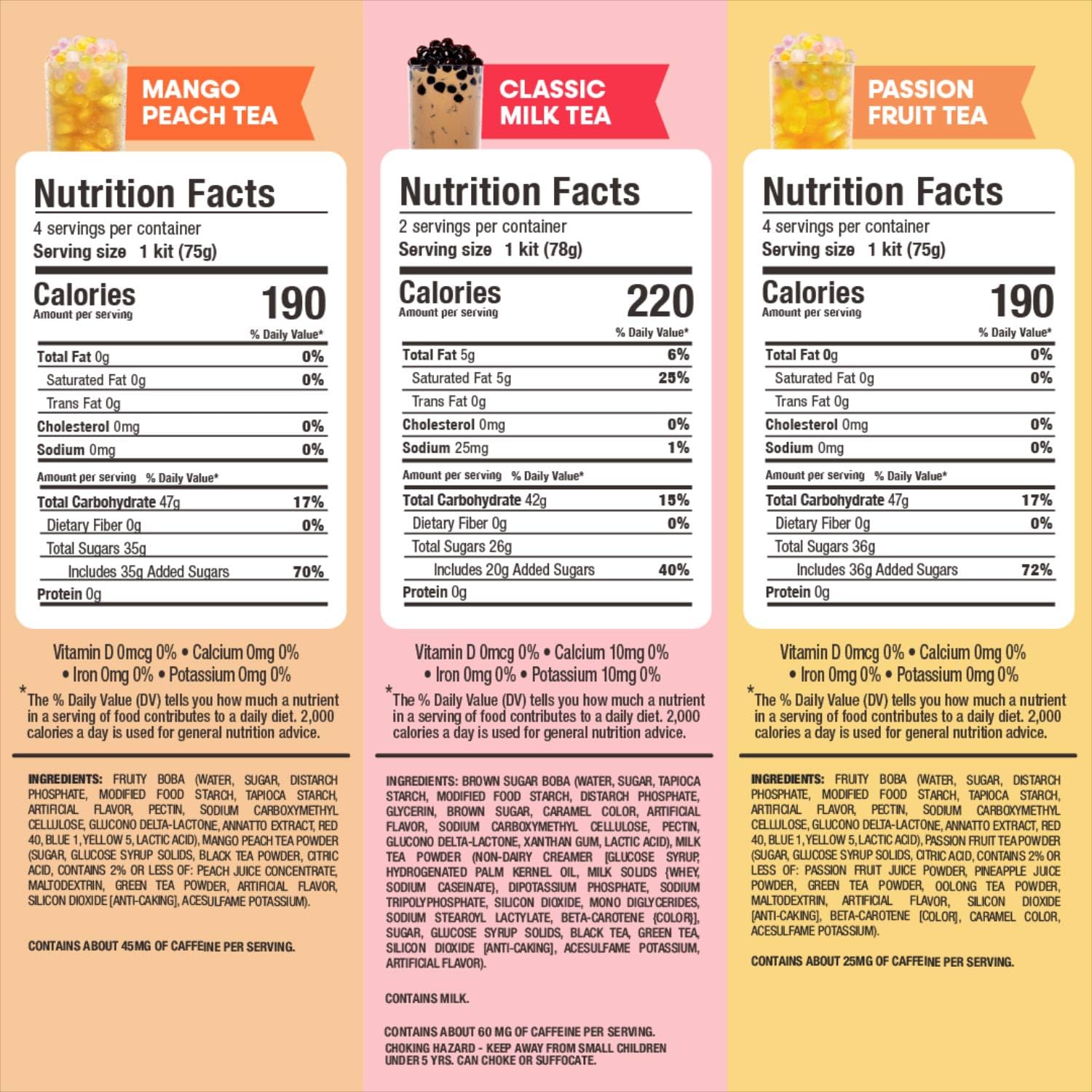 - WHAT IS INSIDE – 4 packs of brown sugar Bubble Pearl, 6 packs of fruity pearls, 2 classic milk tea packets, 2 taro milk tea packets, 3 pineapple passionfruit green tea packets, 3 mango peach black tea packets, and 10 extra wide paper straws.