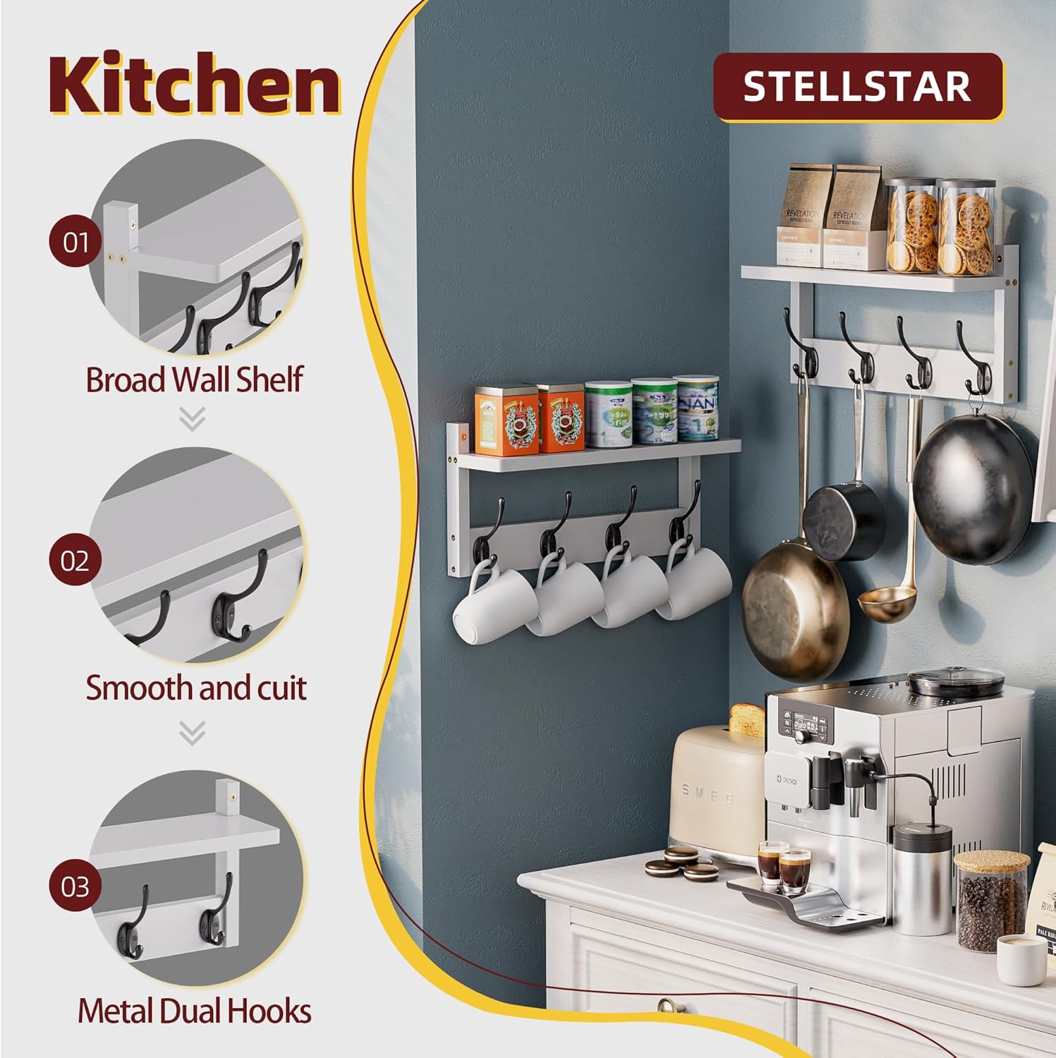 - 8 DOUBLE HOOKS WITH SHELF:Boasting 8 dual-purpose hooks, it presents ample hanging space for various items like coats, hats, scarves, backpack, etc. The well-spaced hooks optimize space and prevent garment bunching. Each wall-mounted coat and key rack has a 15.75 x 4.3-inch (40x11 cm) top shelf, serving as a display area for decor, frames, plants, and a storage nook for collectibles, blending function and style