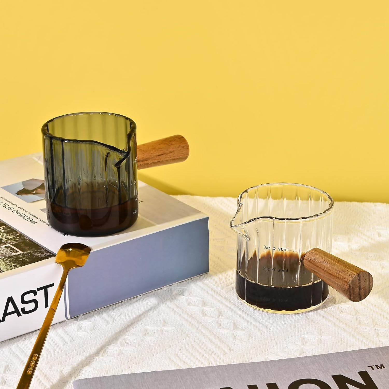 Glass Measuring Cup, 3oz Espresso Shot Glass with Wood Handle, Single Spout Measuring Cups Pitcher Milk Cup Coffee Shot Glasses (Gray Ribbed)