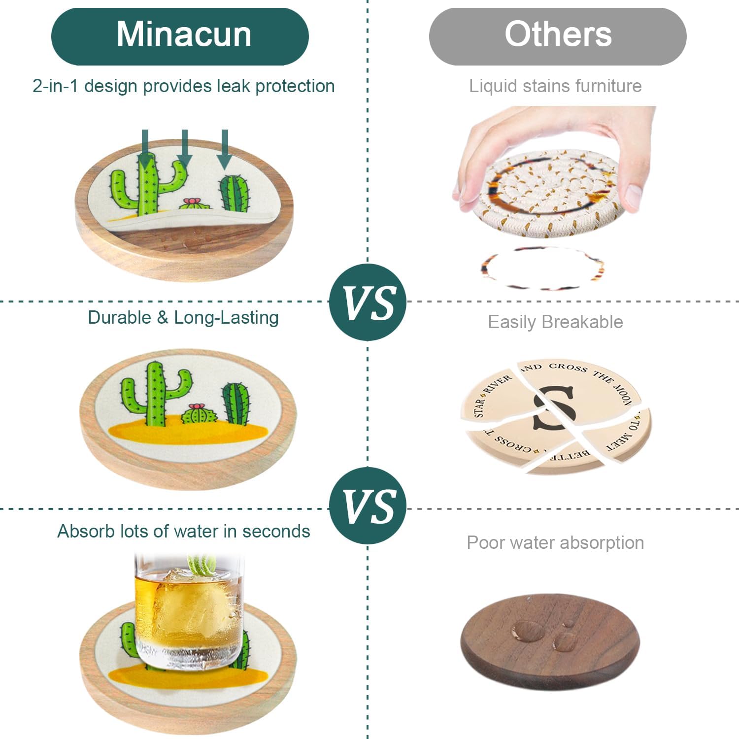 - 🎁Non-slip & Non-stick cups: Minacun Wooden coaster with 4 soft anti-slip pads on the bottom, which protect the surface of your furniture from scratches or damage, and prevent sliding all around; high-quality felt has good absorption that doesn't stick on the glass when you pick up the drink, prevents falling and noise, suitable for cold or hot drinks.