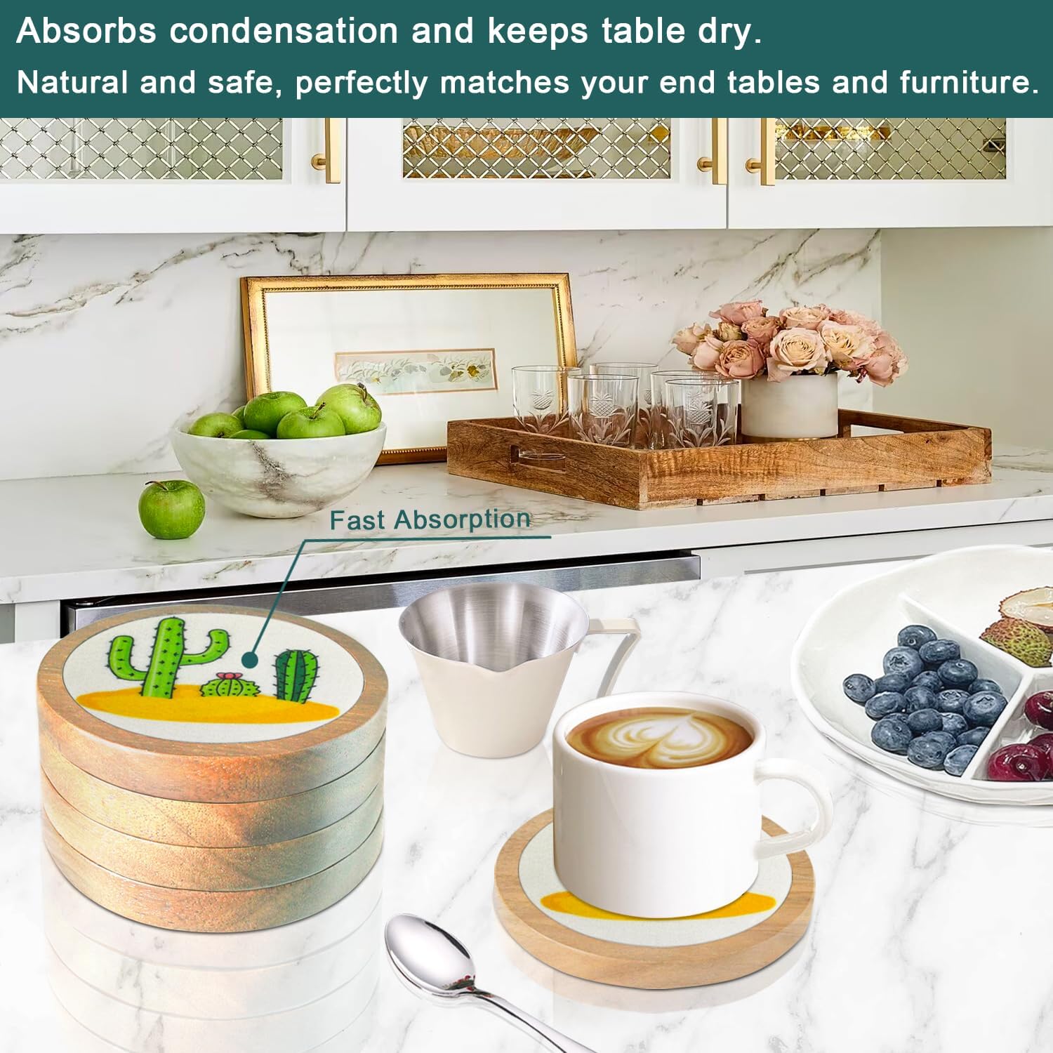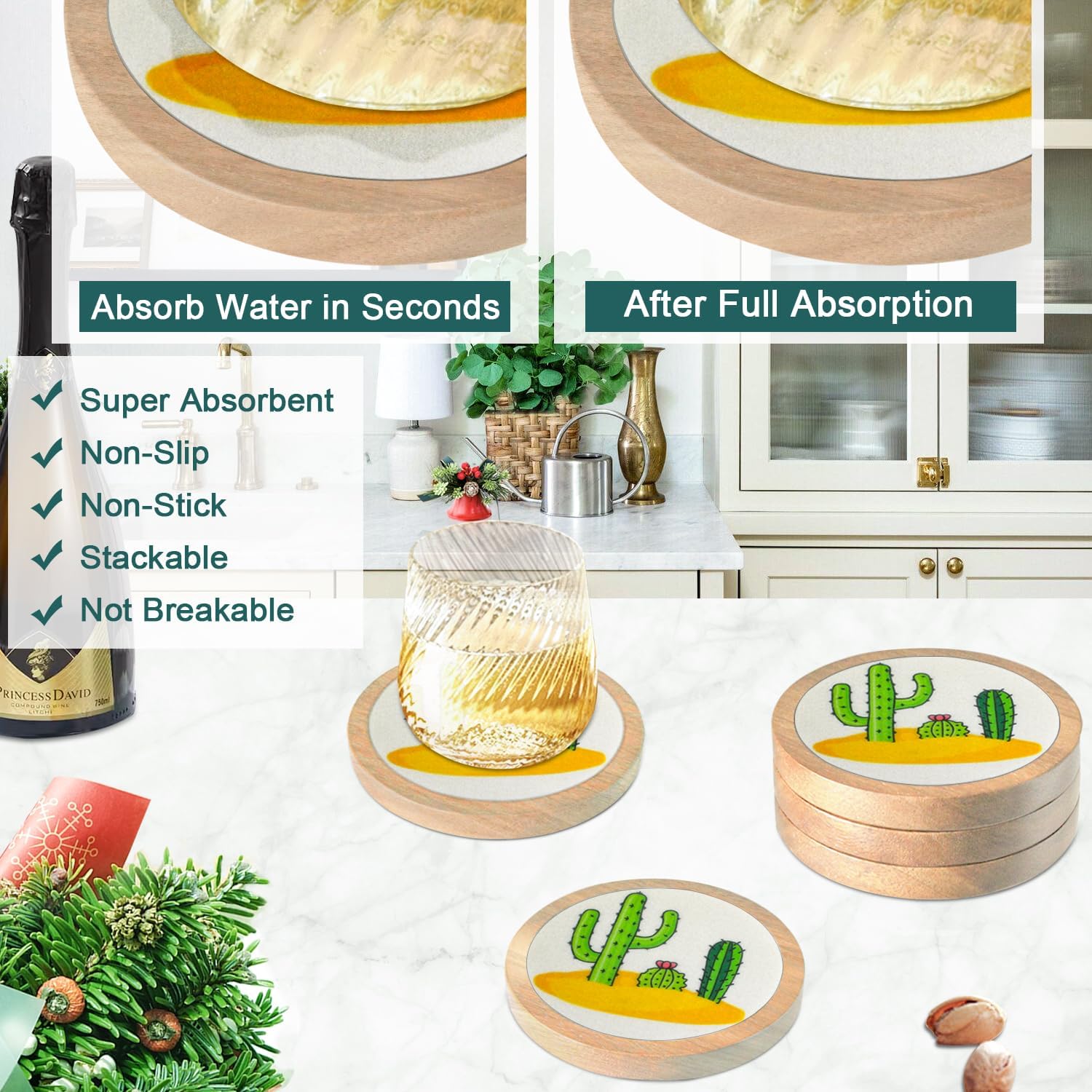 - 🎁Super Absorbent Coasters: Cup coasters with built-in thickened felt pads for stronger water absorption and heat insulation, capture liquids quickly were prevent any spills, keeping your tabletop clean and tidy, with no stains and water rings; extra large size easily accommodates cups of all sizes.