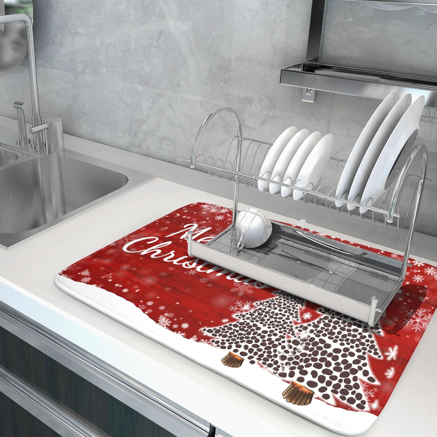 - 1【High Quality Material】:Our merry christmas tree drying mat is made of high absorbent microfiber and the middle is made of composite spongedurable, reversible do not fade and comfortable. At the same time, it can protect your kitchen counter from scratching by the tableware.