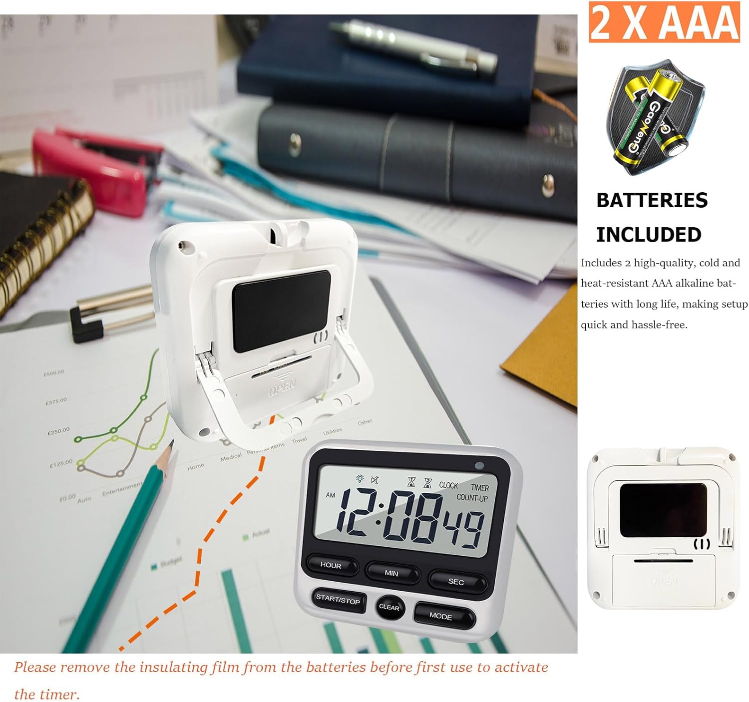 - 【Dual Timer & Stopwatch Settings】: Set two independent timers or stopwatches simultaneously, with each countdown timer adjustable up to 24 hours. Perfect for managing multiple tasks with precision.