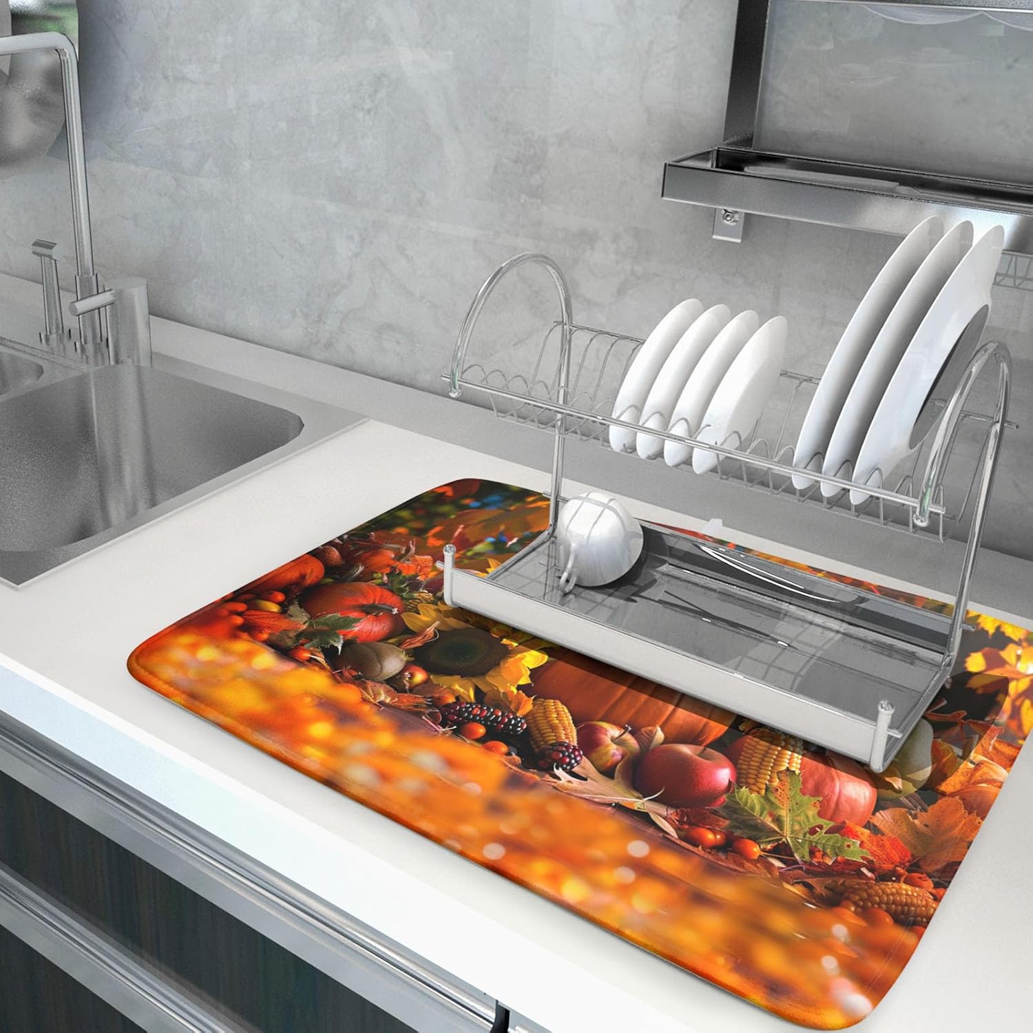 - 1【High Quality Material】:Our thanksgiving pumpkin drying mat is made of high absorbent microfiber and the middle is made of composite spongedurable, reversible do not fade and comfortable. At the same time, it can protect your kitchen counter from scratching by the tableware.