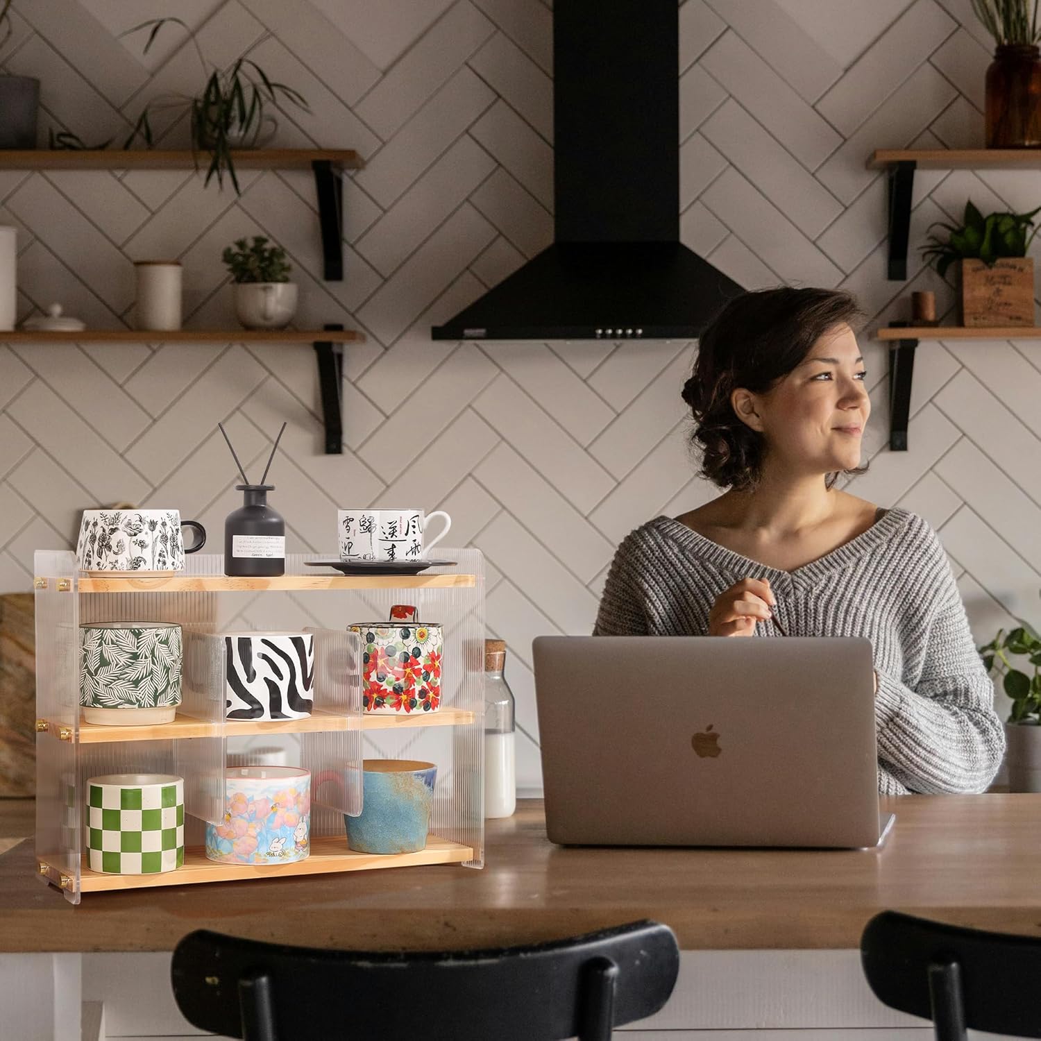 - Stylish Design: Featuring wavy acrylic side panels and a natural wood board. The sturdy construction ensures that it can hold the weight of multiple mugs without wobbling or tipping. this organizer presents an aesthetically pleasing texture, ideal for coffee bar enthusiasts and those who love to decorate their spaces.