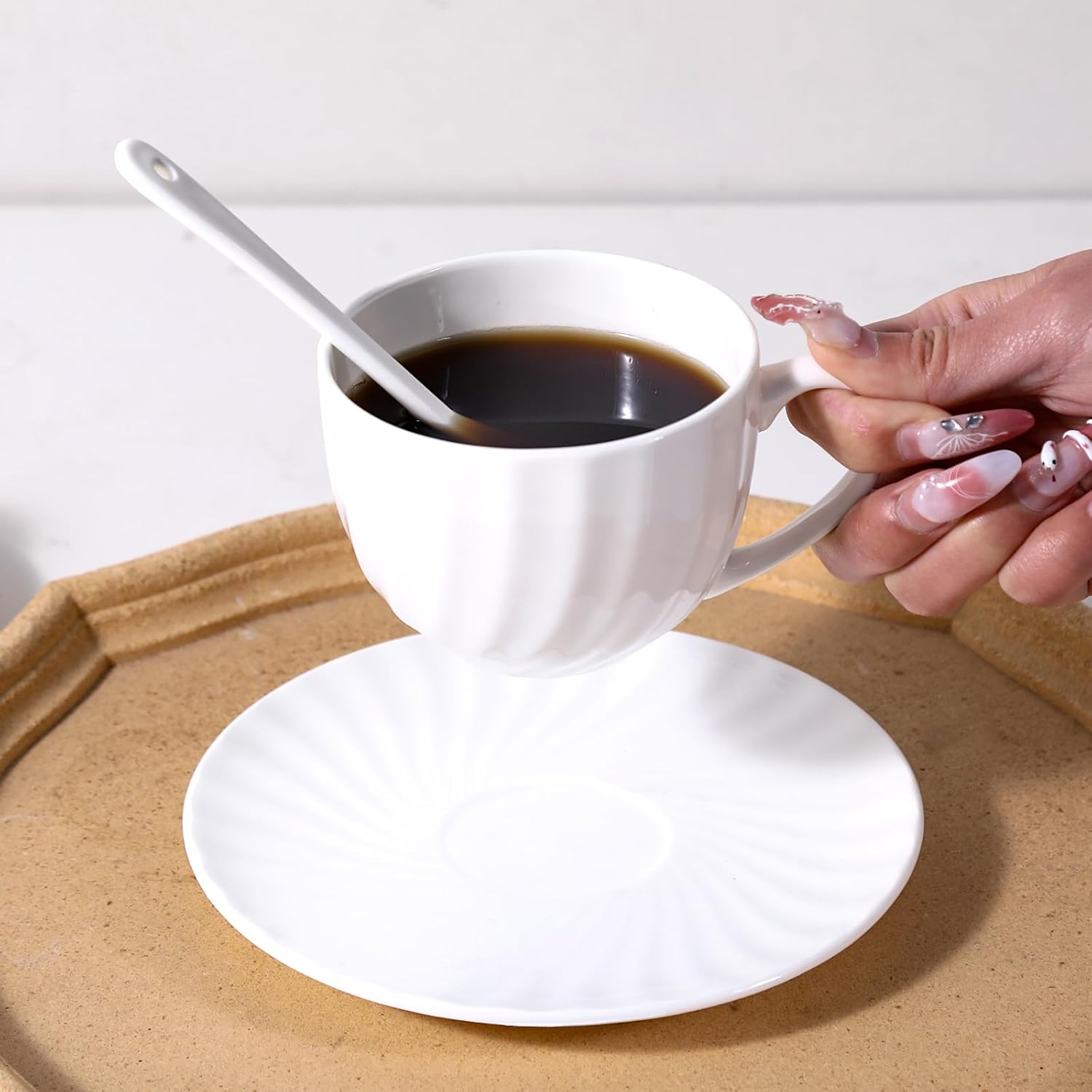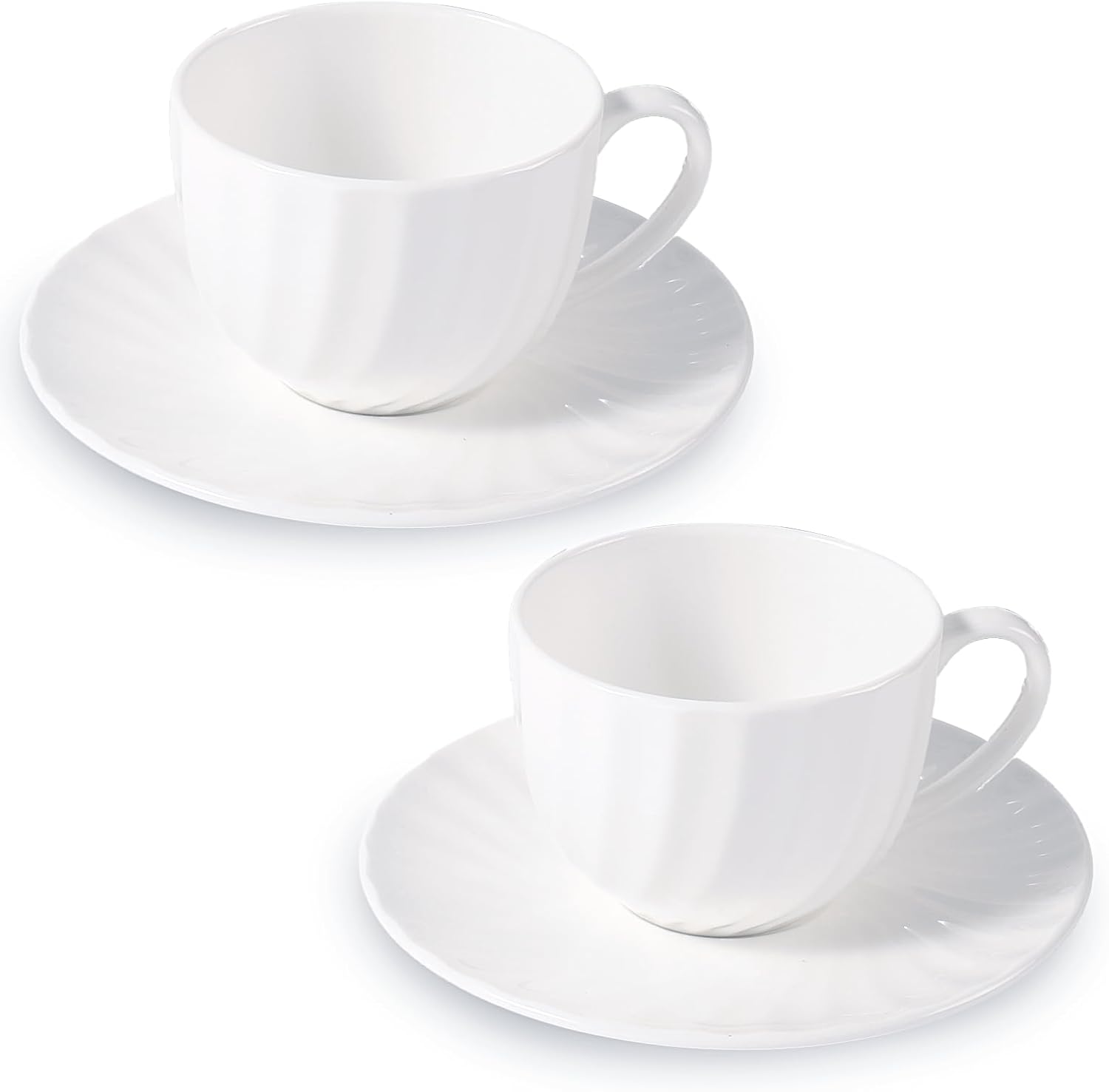 - [Artistic Design] This set includes two 7 oz coffee cups and two matching saucers, featuring a unique spiral design with smooth and elegant lines, it adds an artistic touch. Crafted from high-quality bone china, it offers a refined texture