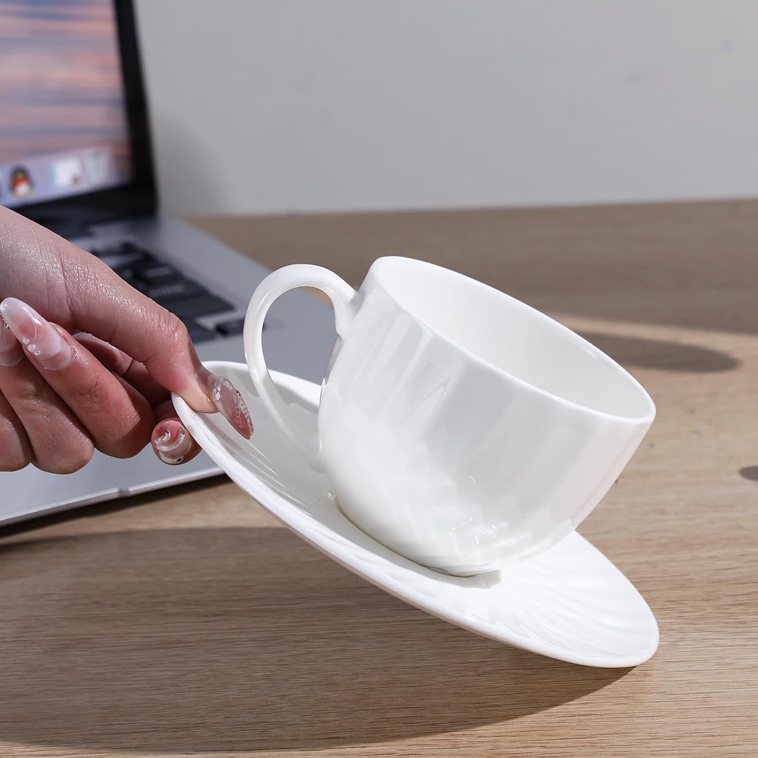 - [Luxury Bone China] Our cups and saucers are handmade from high-quality bone china. Compared to ordinary porcelain, they feature a more elegant whiteness, lighter weight, superior heat retention, and enhanced durability. When light passes through the mug's walls, it emits a soft, moonlight-like glow