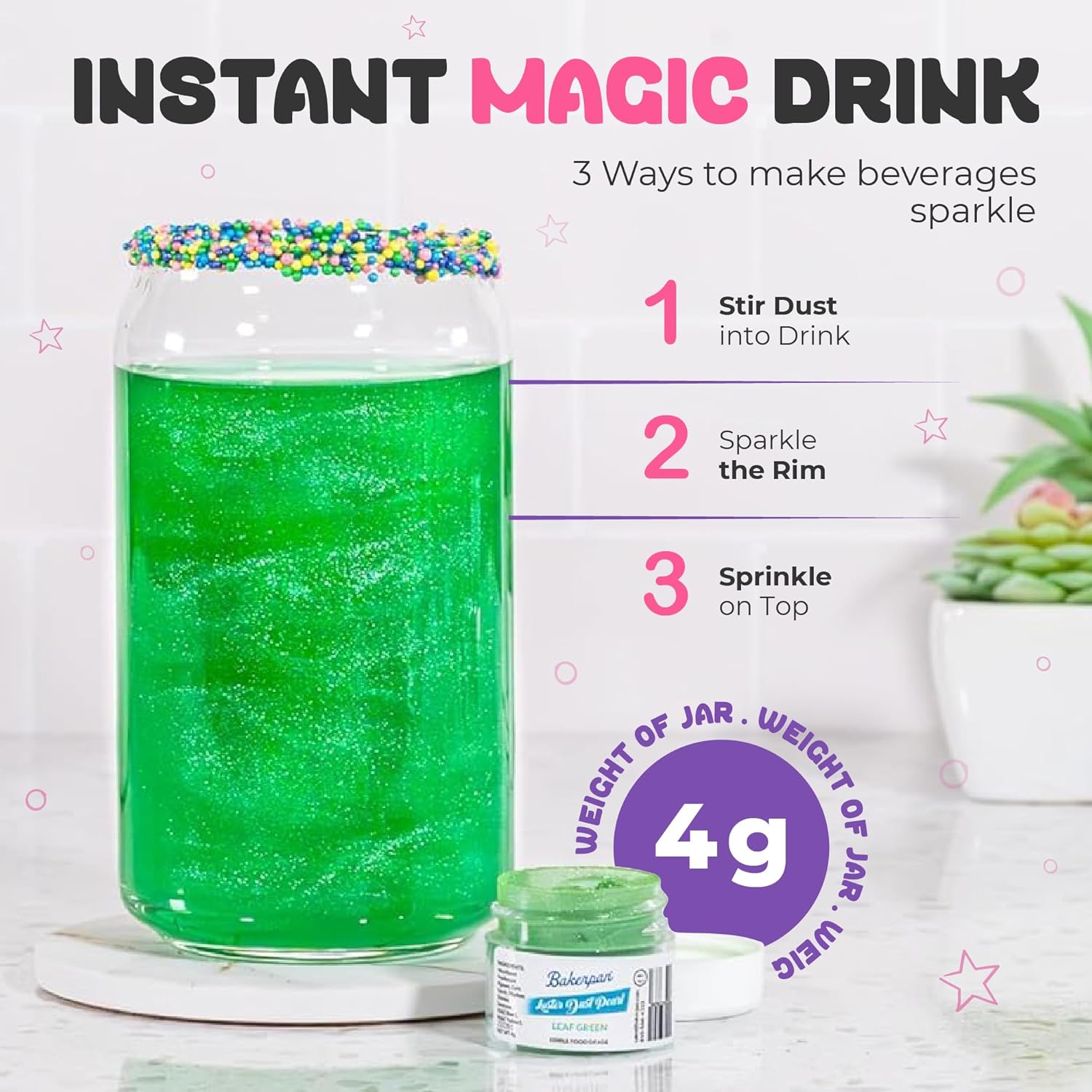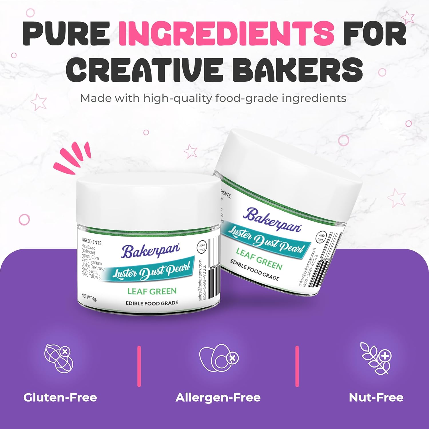 Bakerpan Pearl Luster Dust Edible, Leaf Green Edible Glitter for Cocktails, Set of 2-4 Grams Glitter for Cake Decorating, Cookies, Chocolates and Candies, Drinks (Made in USA)