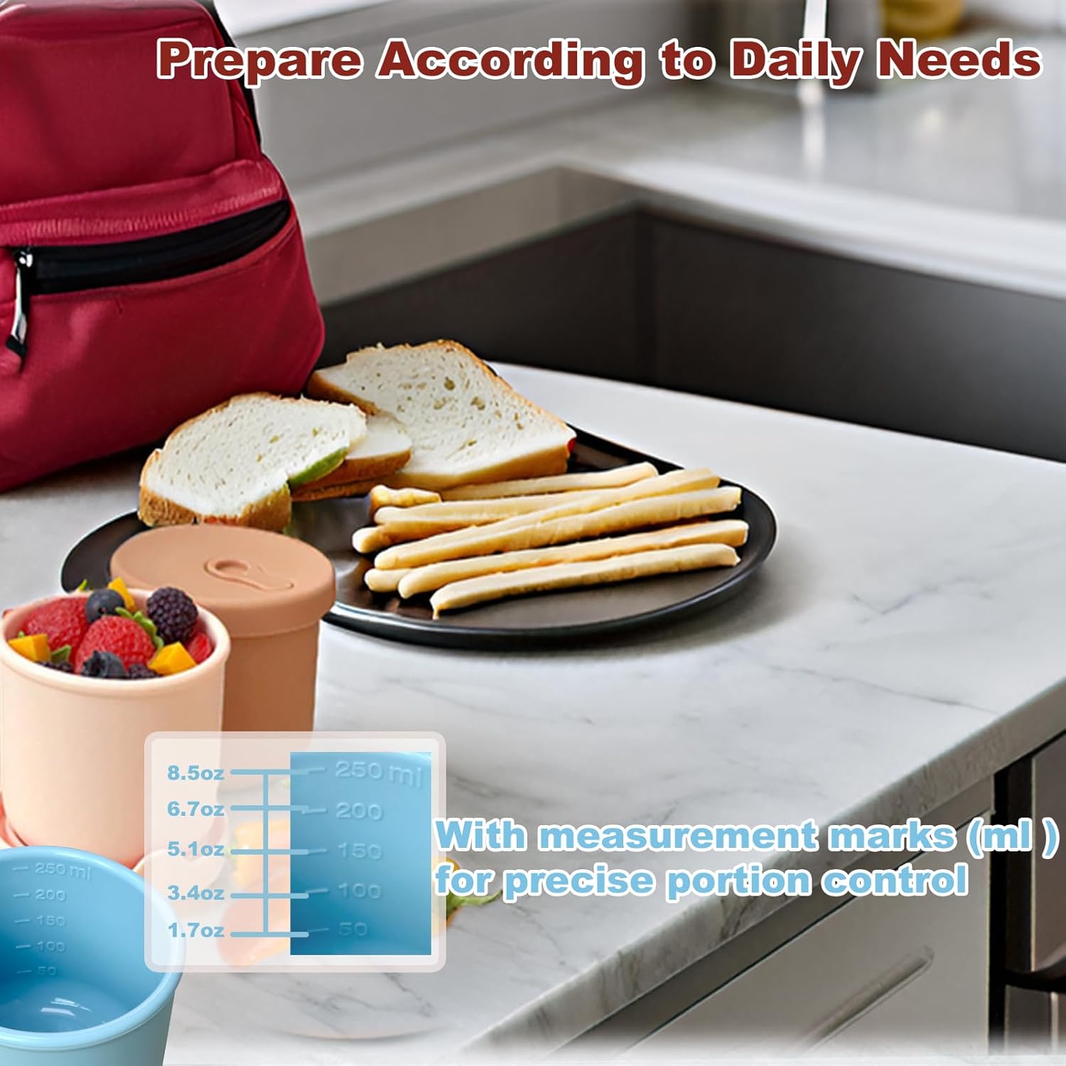 - Food Containers Portable Size: Each kids lunch box containers size is 3.5x3x3.1 inch / 9x7.7x7.9cm. Each silicoen food storage containers available volume is 8.5oz ( 250ML). And each baby food sotorage container has measurement markings, help you accurate measurement.