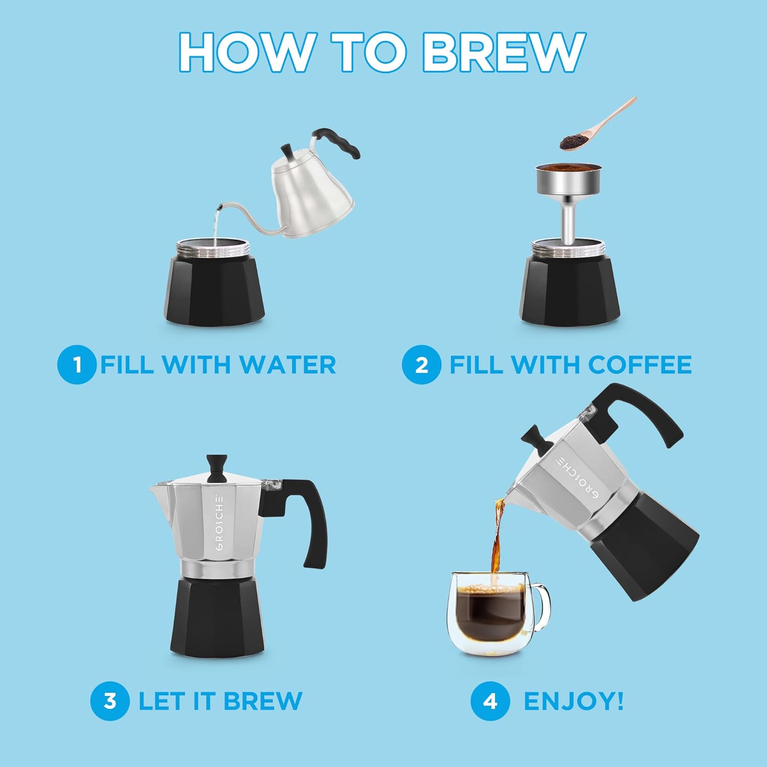 - EASY TO USE: Add water just below the safety valve and fill the coffee funnel completely with fine ground coffee, without tamping or compressing it. Screw on the top chamber until snug, ensuring the silicone seal is in place. Place the Moka pot on low to medium heat on the stovetop. In about 4-6 minutes, the coffee will bubble through the funnel into the top chamber. Remove from heat and pour into your cup.
