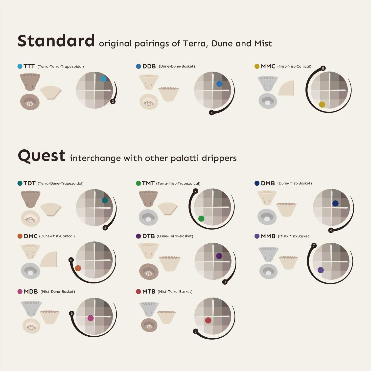 - Three Distinct Drippers for Versatile Brewing: The Palatti 3 Drippers Set includes Terra, Mist, and Dune—each offering a unique brewing experience. Terra, with its lower flow rate, delivers deep, full-bodied coffee with bold flavors. Mist, with its higher flow rate, creates a bright, lively cup, ideal for floral or fruity notes. Dune, with its medium flow rate, provides a balanced, steady flow for a smooth, consistent brew that highlights subtle complexities. With these three drippers, you can explore and perfect a wide range of brewing styles.