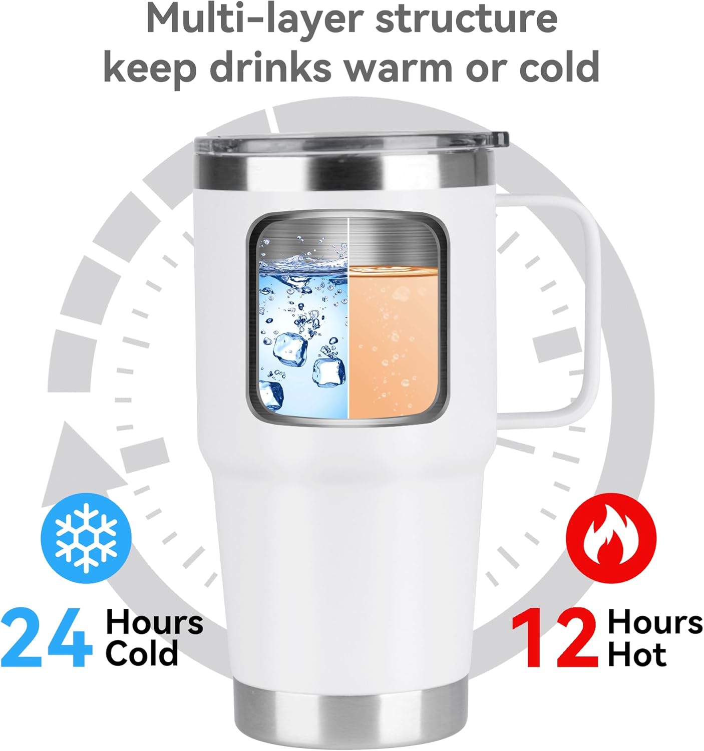 - Stainless Steel Tumblers with Handle:The 20oz coffee mug is made of thickened 304 stainless steel, liner of coffee mug will not produce any taste and will not rust.The cup comes with a sturdy welded handle for easy grip and ease of use