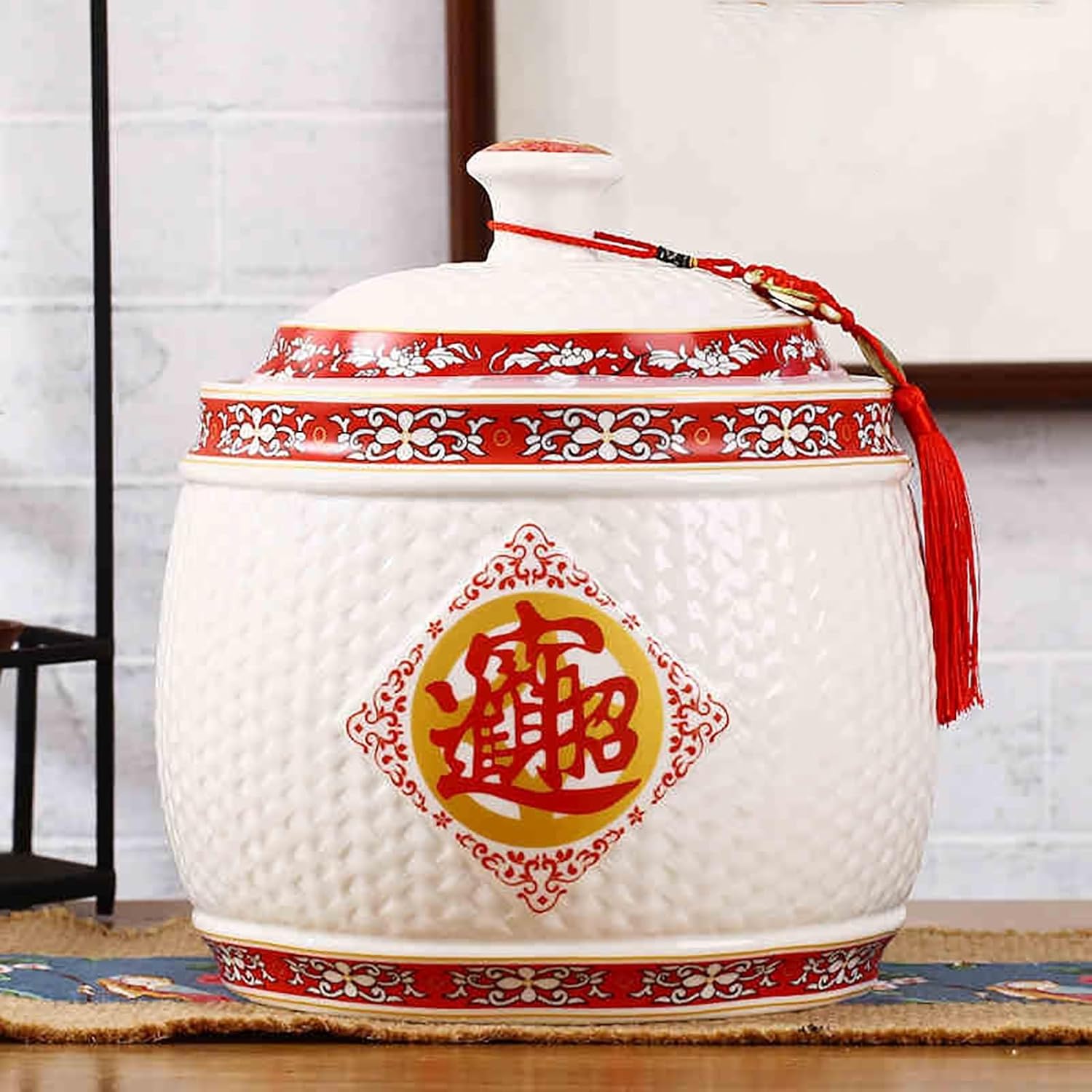 Chinese Sealed Large-Capacity Rice Pot, Ceramic Rice Bucket With Tassel Design, Grain Storage Ceramic Container, Rice Dispenser Airtight Storage Bucket For Grains Snacks Candy Coffee Beans Food(A,Capa