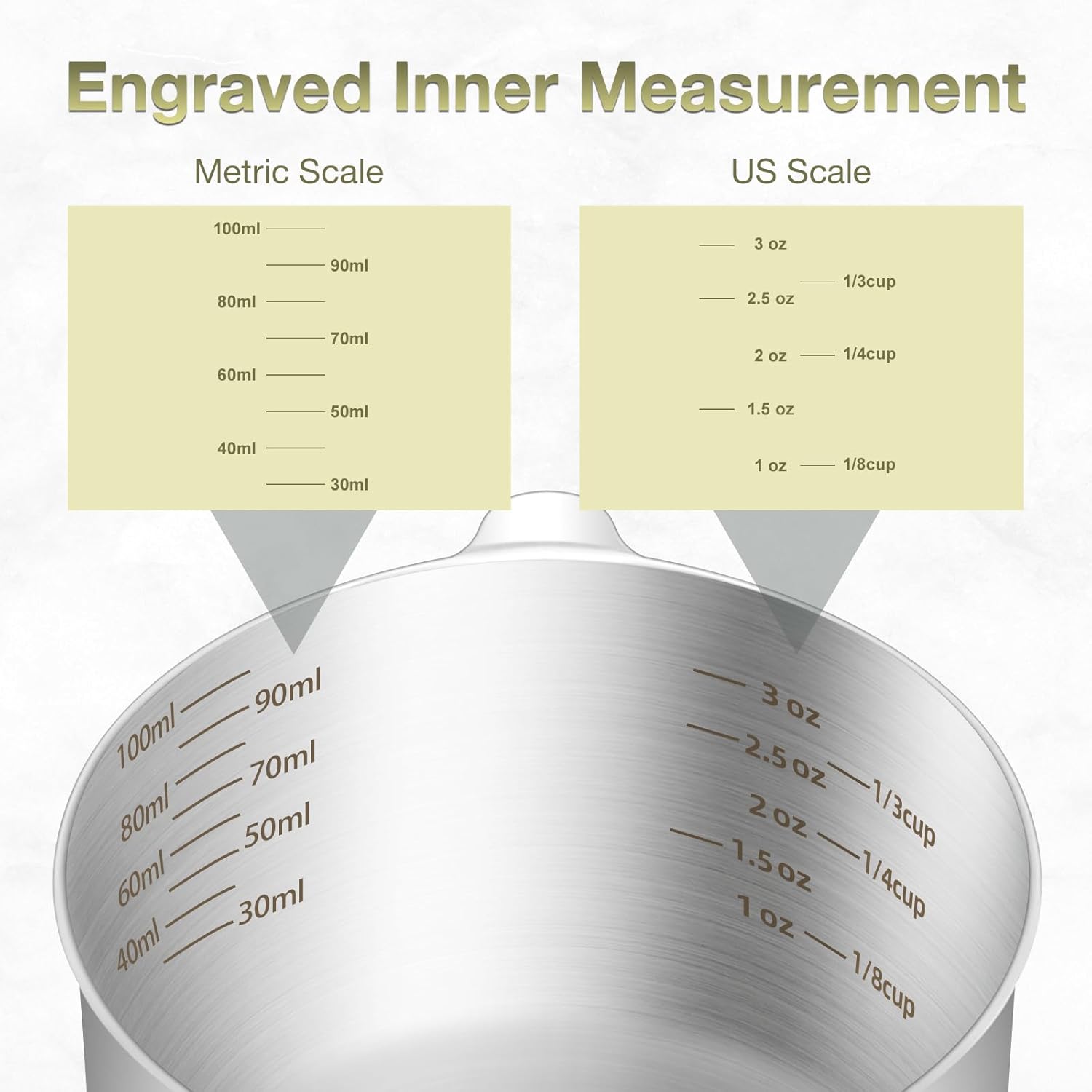 - Dual Scales Available - Engraved clear and accurate METRIC & US scales on the inner side will never fade and can be seen forever. It can meet different needs and let you know the amount to add in every time. The all measurement contains 1/2cup(4oz), 3oz, 1/3cup, 2.5oz, 1/4cup(2oz), 1.5oz, 1/8cup(1oz), 100ml, 90ml, 80ml, 70ml, 60ml, 50ml, 40ml, 30ml