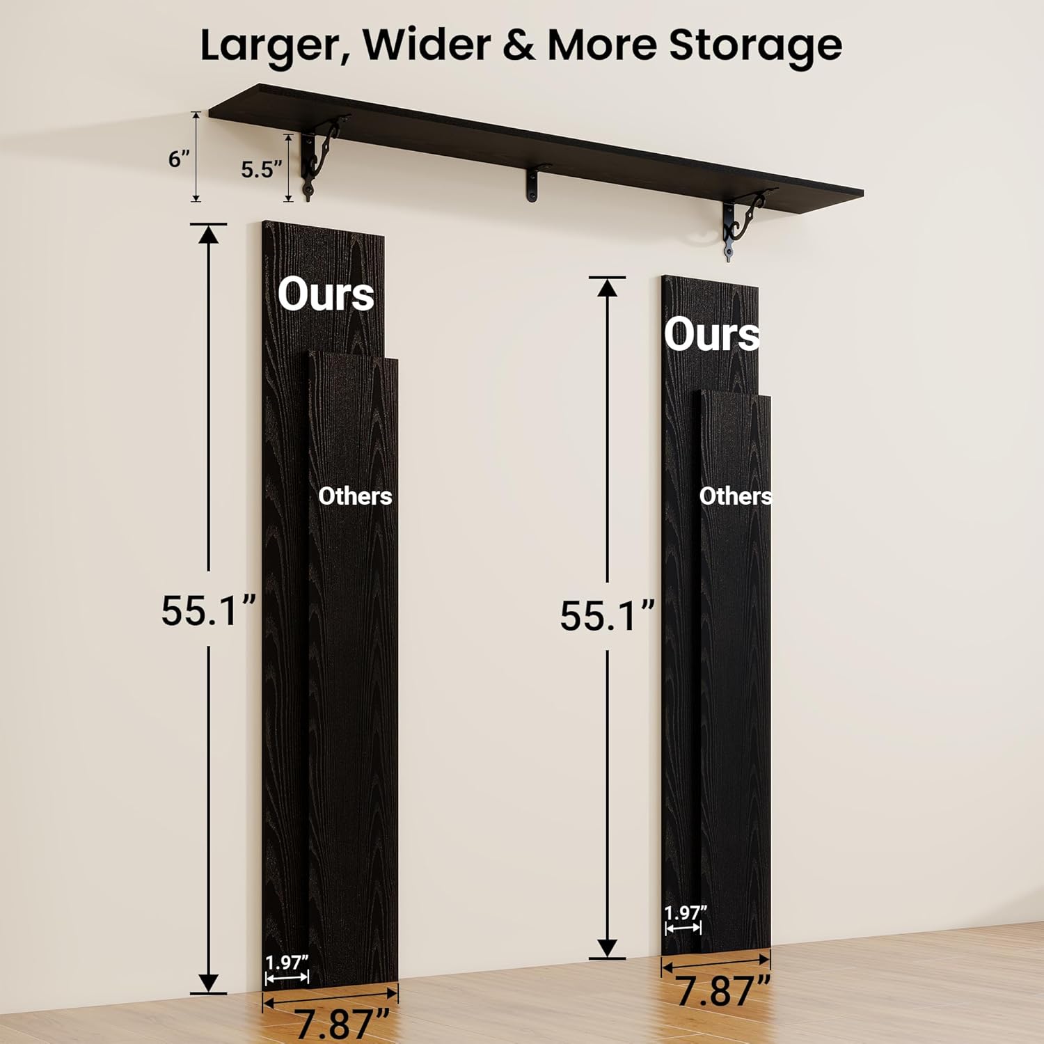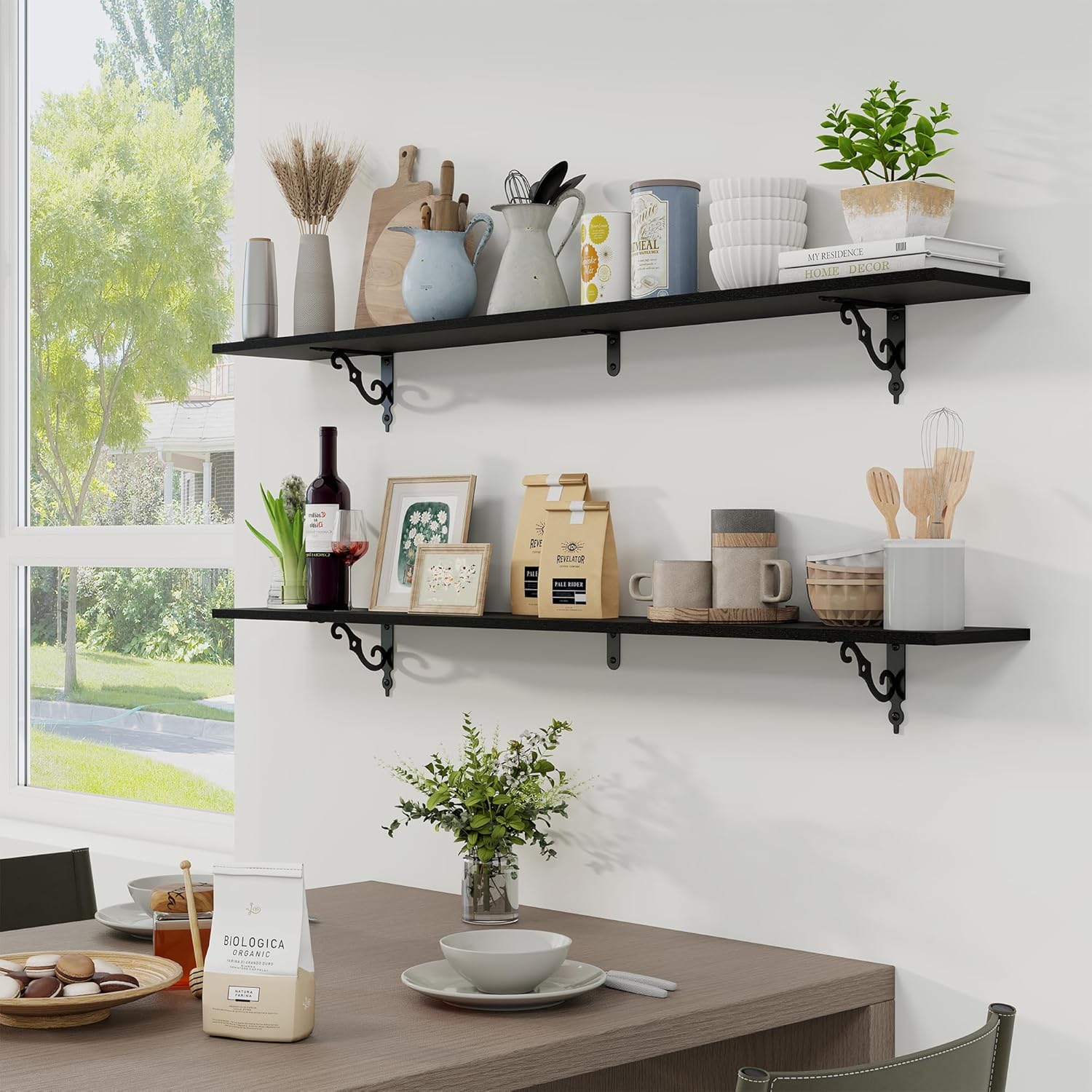 RICHFOCUS Floating Shelves for Wall Decor, 55.1W x 8D Wall Shelves Set of 2, 8 Inch Deep Rustic Wood Shelves Wall Mounted with Brackets, Long Floating Shelves for Living Room Bedroom Kitchen, Black