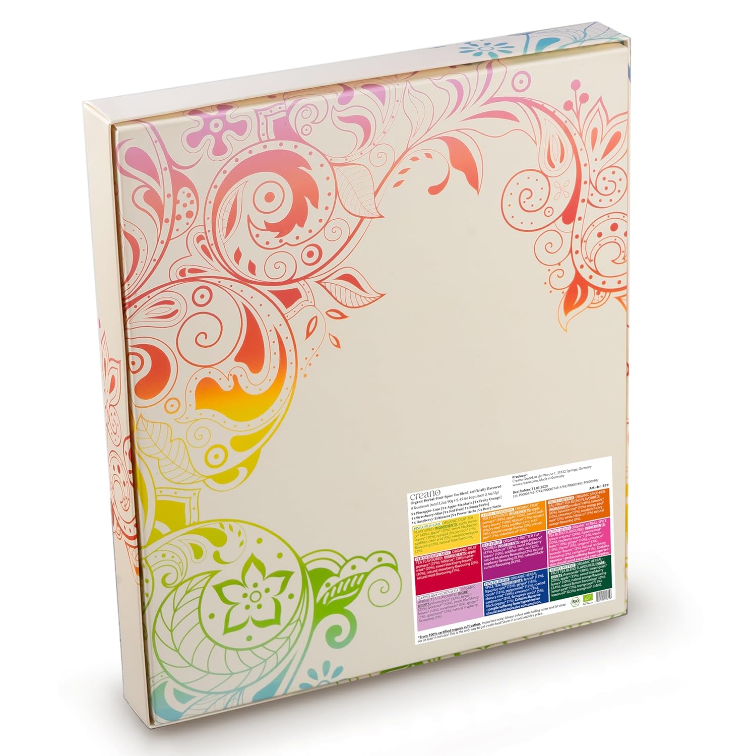 - Creano Organic herb fruit spice tea mix gift set is a unique blend of the different organic tea varieties: strawberry mint, red fruit, sunny herbs, raspberry echinacea, herb power, berry still, pineapple lime, apple mandarin, fruity orange