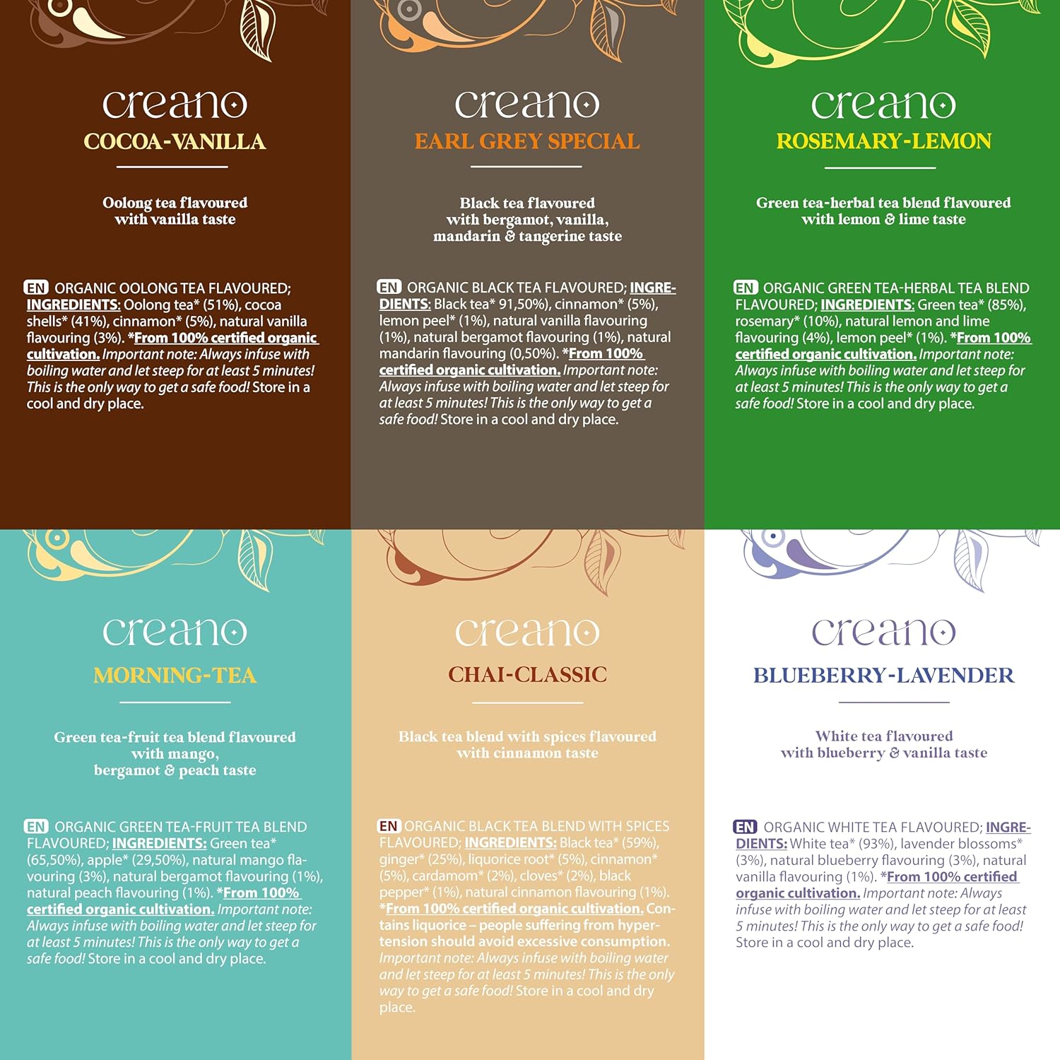 - Creano Organic Tea Mix Gift Set is a unique blend of the different organic tea varieties: Rosemary-Lemon, Morning Tea, Chai Classic, Blueberry-Lavender, Cocoa-Vanilla, Earl Grey Special