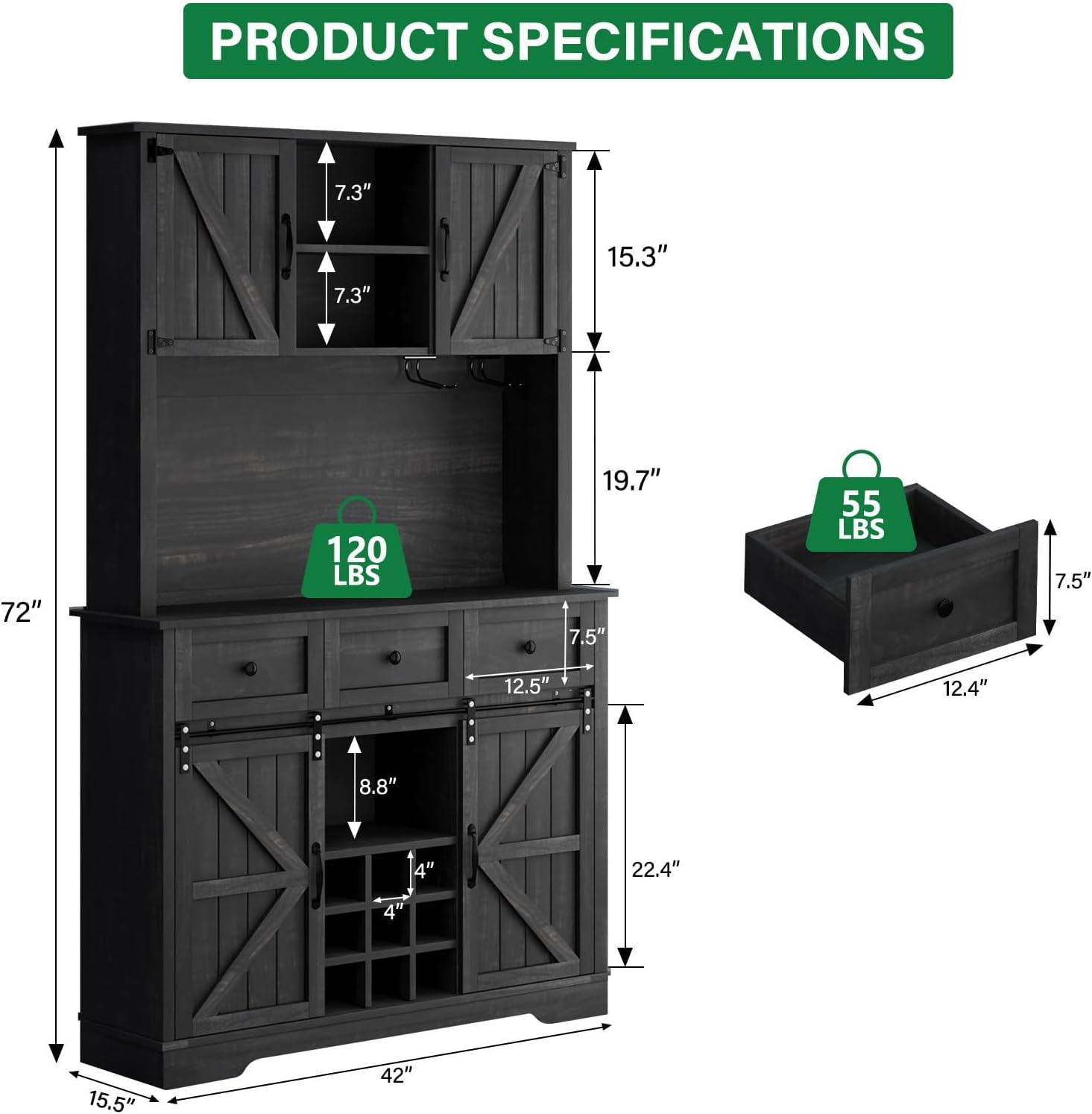- Farmhouse Coffee Bar Cabinet: Kitchen hutch storage cabinet with 2 sliding barn doors is not only easy to access the items in the cabinet, but also adds a touch of rustic charm to the whole room, with black metal hardware to make the tall kitchen pantry cabinet more exquisite, and each cabinet has an adjustable shelf, convenient for storing items of different sizes, beautiful and functional