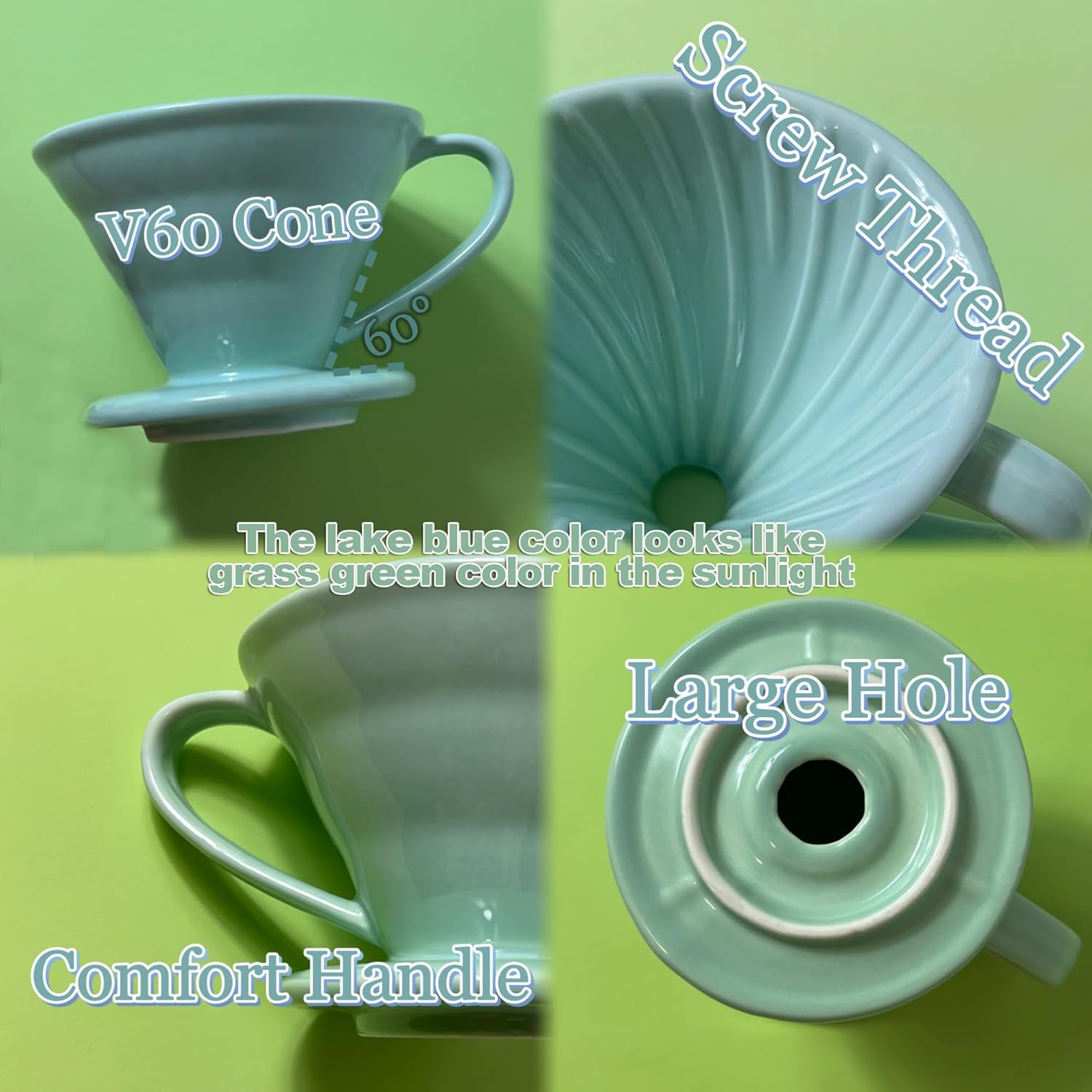 Pour Over Coffee Dripper - Ceramic Pour Over Coffee Maker Cone, Porcelain Coffee Drip, Pour Over Single Cup, Manual Brew Maker for Home, Cafe, Office - 1-4Cup, V60 Size 02 (Lake blue)